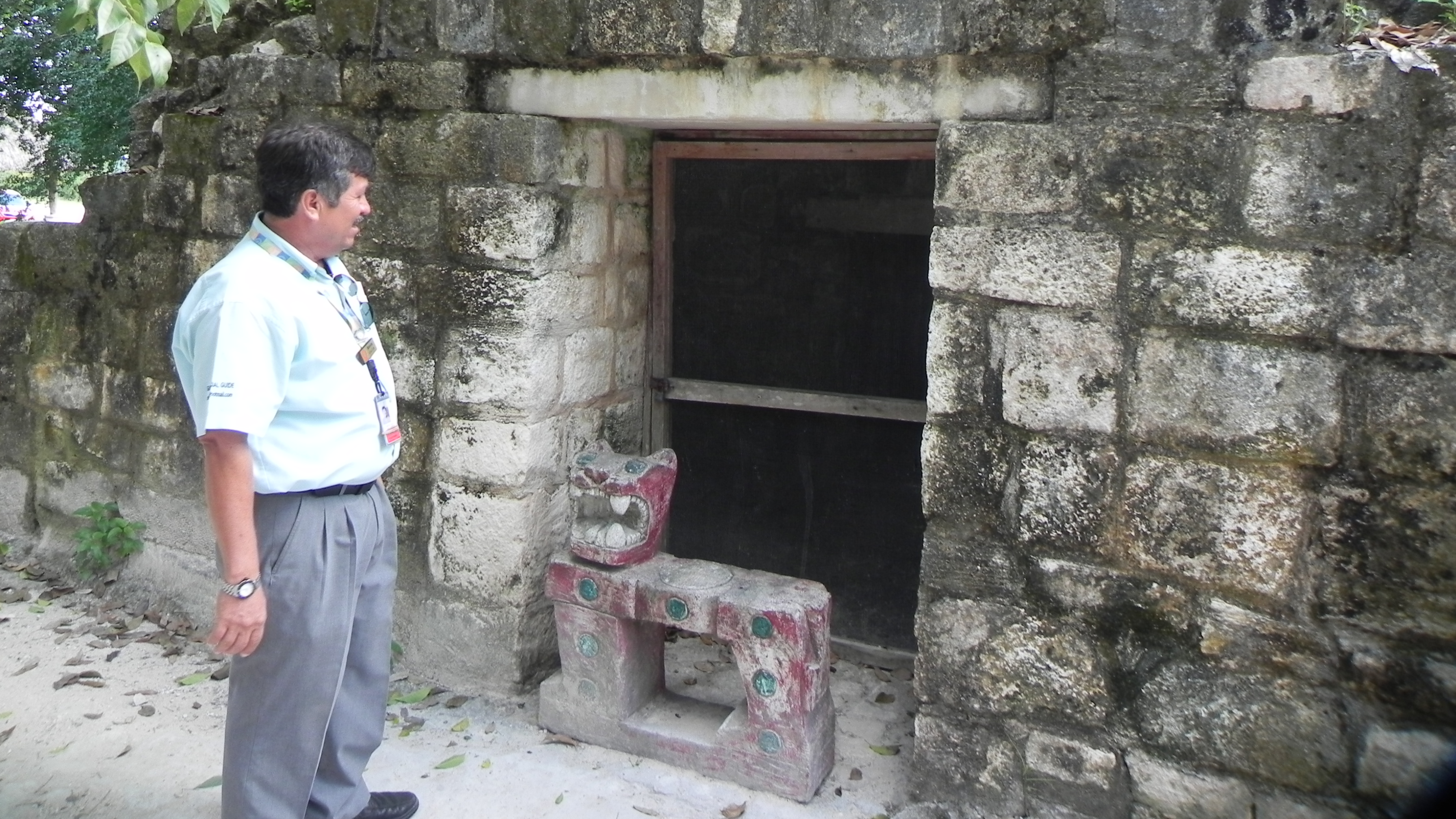 Our guide illustrating how low the original door was into the Mayan Ruin.