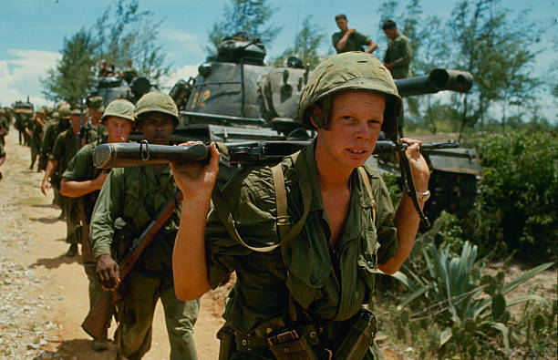 View of American soldiers of 7th Marine Regiment as they march along a dirt road, Cape Batangan, Vietnam, 1965. A pair of tanks drive beside them. (Photo by Paul Schutzer/The LIFE Picture Collection via Getty Images)