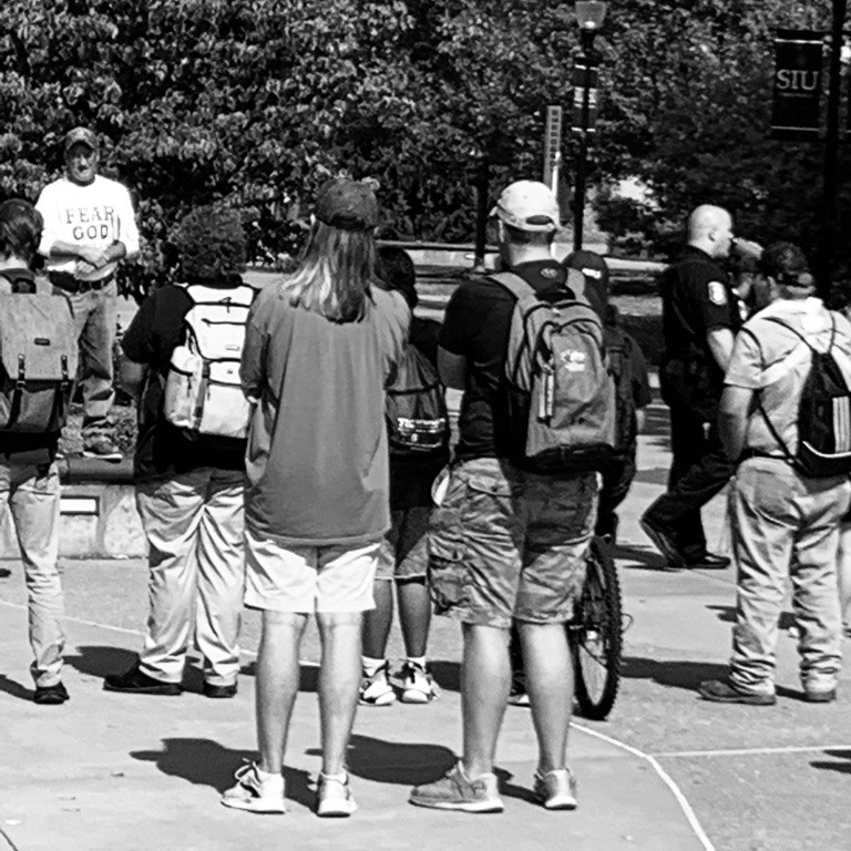 October is a lovely month. I was in Lowes yesterday and there were both Halloween decorations and Christmas Trees. I have been walking the beautiful campus of Southern Illinois University @ Carbondale for 43 years and have seldom witnessed what I did a little over an hour ago. A man asserting that he was, ‘A Child of God,’ speaking loudly to around 100 students as he characterized them as, ‘Whores’ and ‘Sodomites.’ He went on to contend that since he did what the Bible said for him to do…he was loved and protected by God…and that the angry crowd listening to him was bound for destruction. A woman who was acting as a spokesperson for the group of maligned students asked how many of the group had been church members but due to being abused and hurt by churches had ceased to attend…almost everyone raised their hands.