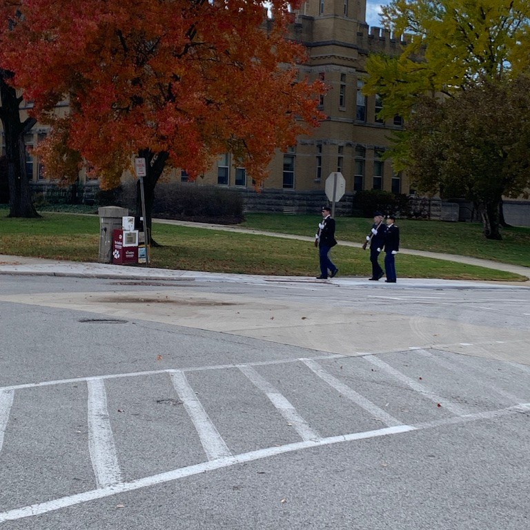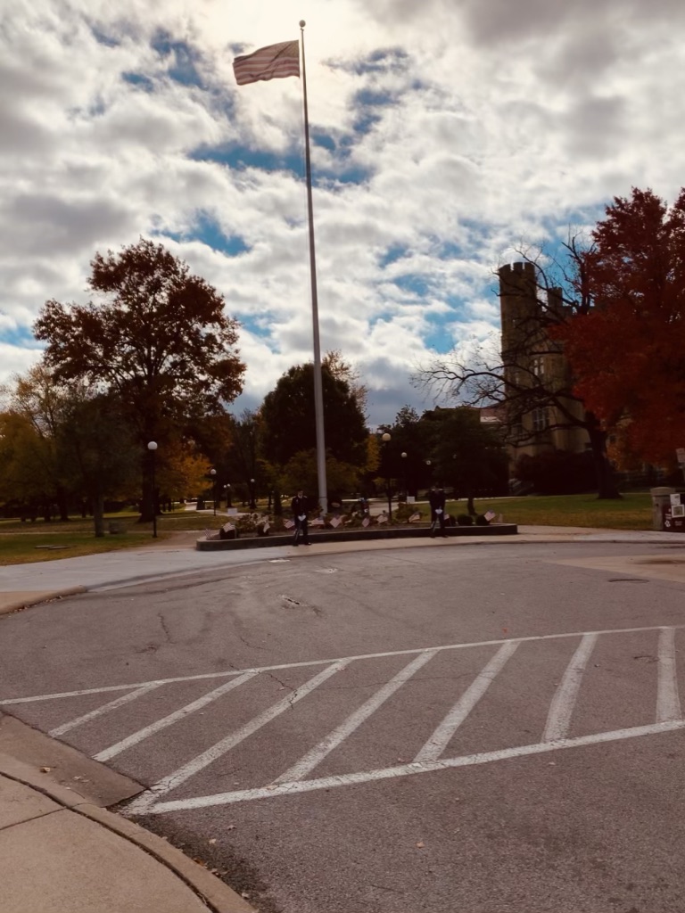 I stood and watched, with tears in my eyes, our ROTC students stand vigil at our American Flag. The dedicated soldiers stood at attention with their heads bowed reverently. The gusty wind blew leaves all around them. Old Glory waved proudly in the wind.