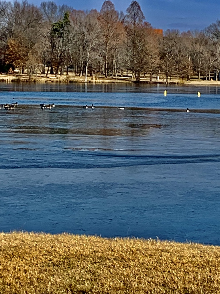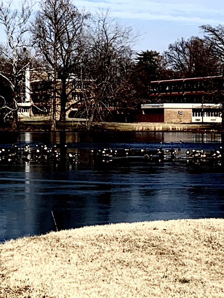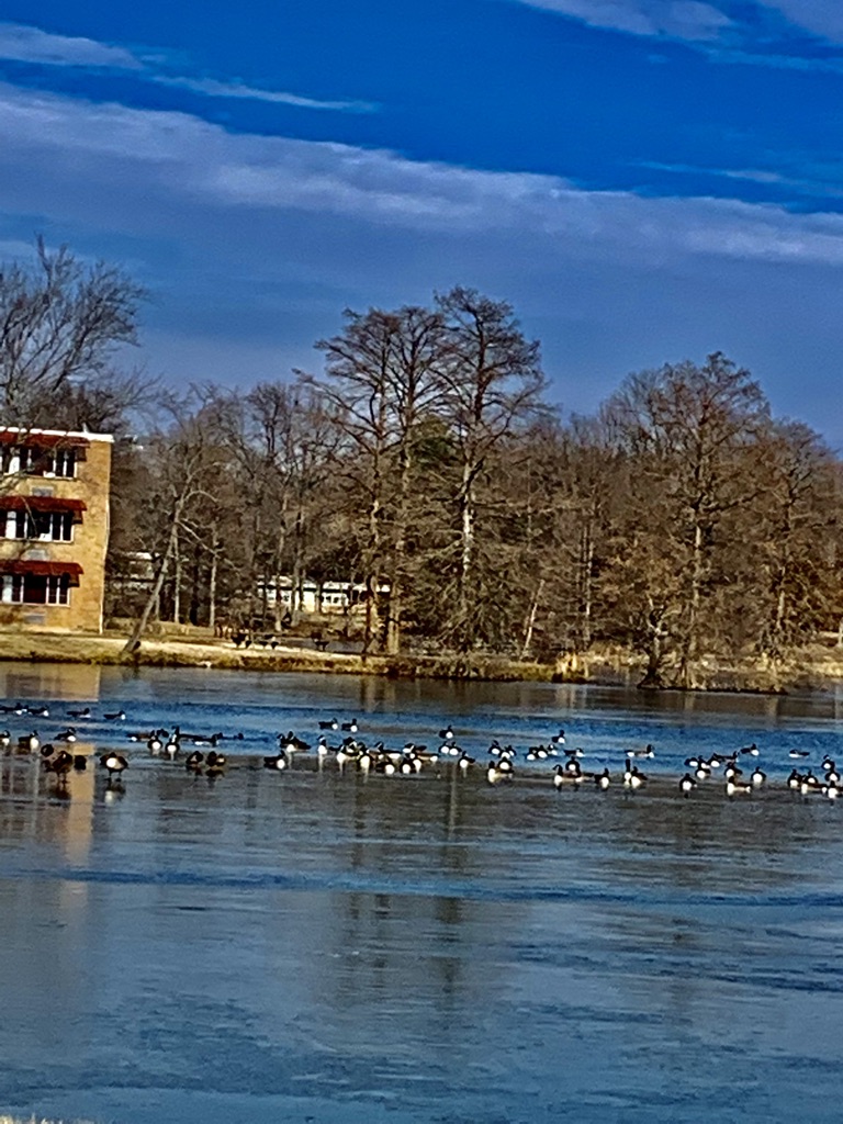 So, today I ventured out as my Omicron Quarantine is over. The cold outside air felt a bit colder than usual after my seclusion. We have been experiencing bitterly cold temperatures and the warming to above freezing…at least for a while…is welcome. I drove out to Campus Lake and there before my eyes were an untold number of geese enjoying the frozen lake. Some honked with a lusty approval when I walked up…while others seemed to take no notice of my presence.