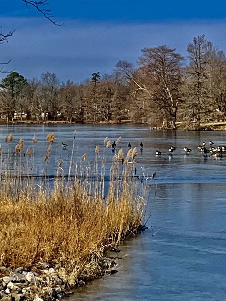 Nineteen degrees that feels like seven with a thirteen-mile-per-hour wind. Our pond is freezing over. Winter brings both a sense of calm and quiet serenity and a pervasive feeling of unease and distress. Snow and ice are lovely to look at and treacherous for we senior citizens to walk upon. I am reminded of a little over five years ago when I fell in December and broke four ribs. I laugh when I see actors portray characters in movies who fight and receive horrible physical abuse and later comment that they are fine…they then comment with a smile, ‘I only cracked some ribs.’ Cracked ribs are no picnic!