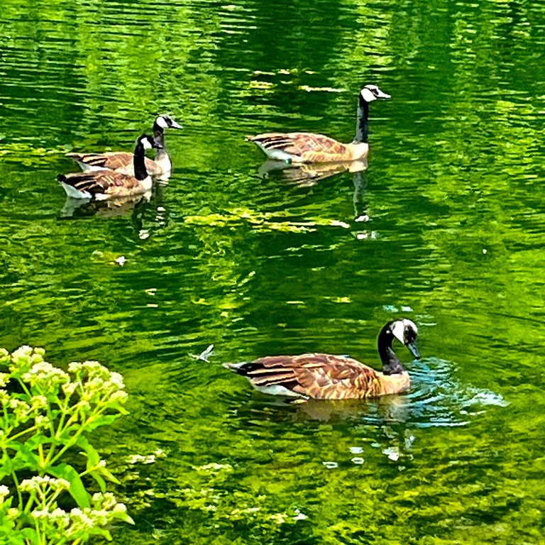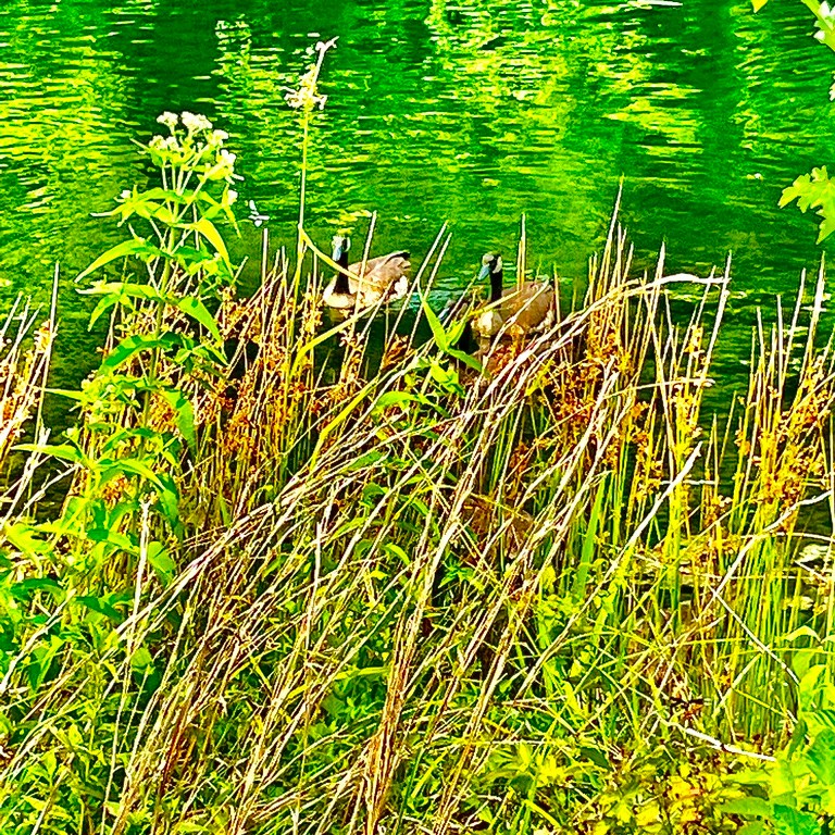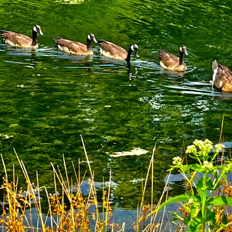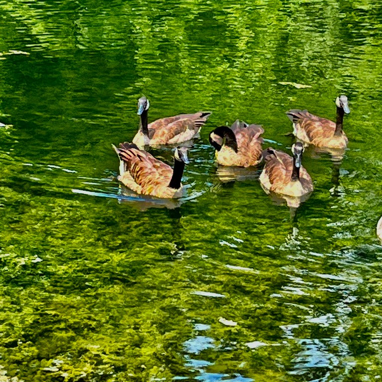 The Geese surprised me this morning. I was at my favorite Campus Pond and when I rounded the corner of some foliage…there were many of them languidly indulging in a Thursday morning swim. When they saw me… they did not flinch or Honk. We have seen each other before. As their world swirled about them…they were singularly focused on the tasks at hand…swimming and bobbing for food.