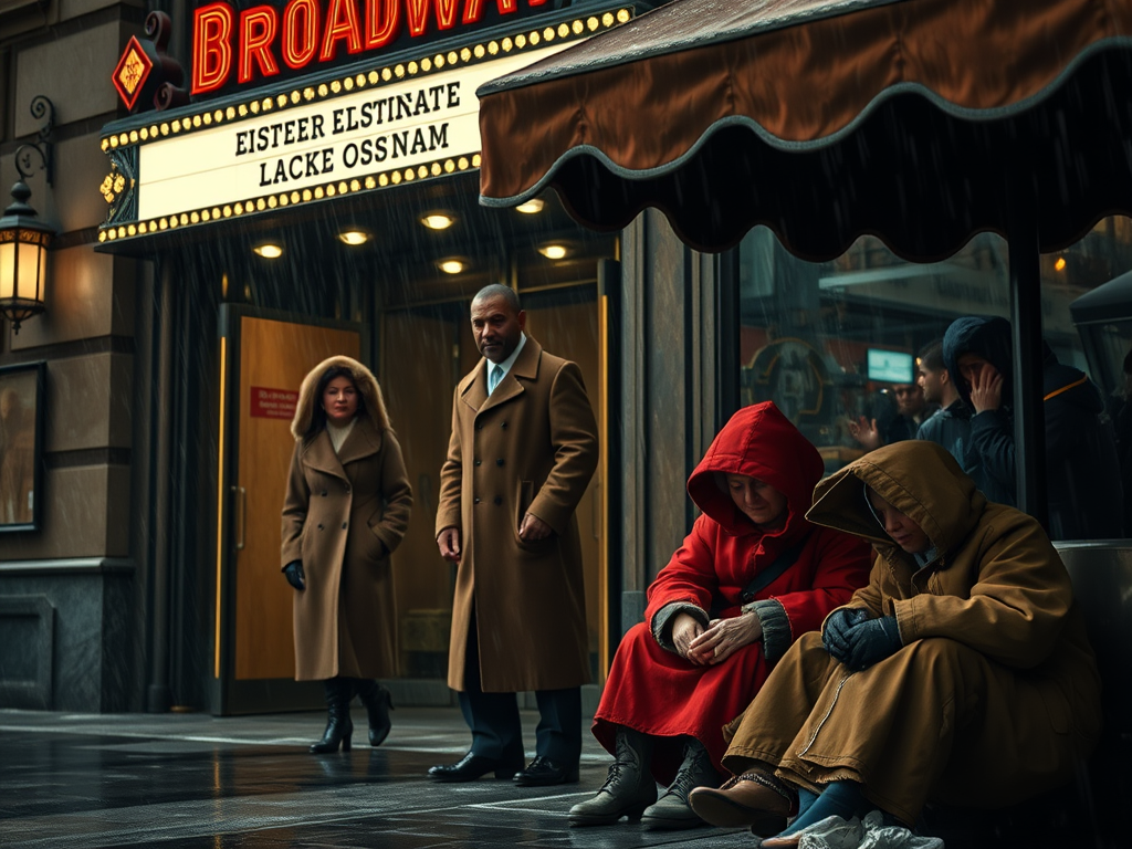 Miriam held Anna close and wrapped the old blanket around her tightly. The ice kept falling. The awning provided some shelter against the frigid rain. Broadway Theatergoers walked along the boulevard with cashmere overcoats and waterboots. ‘This weather is terrible Rodger… I would have preferred another night to see the premier,’ Daphene said with a frown. ‘You know how I hate to get my hair wet,’ Daphene continued. ‘I hope our seats are front row,’ Daphene sighed.