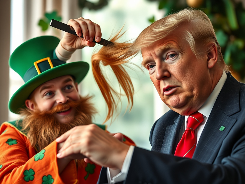 ‘Sure and begorrah I loved JFK he had the heart of an Irishman,’ Shamus said. ‘We visited often and he was a lusty devil but a fine leader,’ Shamus winked. ‘Joe Biden was a man of his word and loved we Leprechauns,’ Shamus said. ‘Joe promised help for Ireland and he delivered,’ Shamus noted as he line Danced with Harper. ‘Now Trump told me to visit him today and he would have a pot full of Gold for me in the Oval Office…when I went to retrieve it there was a gold-colored pot with gold-colored sneakers inside,’ Shamus frowned.