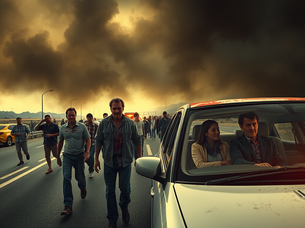 ‘Ahead a man is flagging cars to stop,’ Son said. ‘He looks tired and concerned,’ Son continued. ‘There are a lot of flashing lights,’ Son continued.