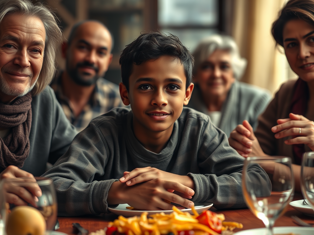 ‘Come in and join us for dinner,’ Jim said with a wide smile. ‘I know you must be hungry,’ Jim continued. ‘We are glad to have you at our table,’ Jim said as he patted the Poor Boy on the shoulder.