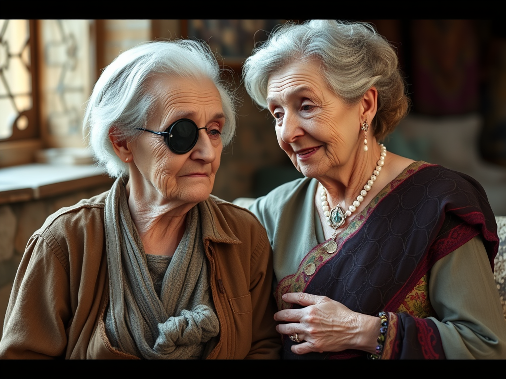 ‘Neva J, you are a saint,’ Abigail said to her friend. ‘No one would speak to me in town until you came,’ Abigail noted. ‘They call me One Eye as a joke and for a laugh as I lost my eye in an accident years ago,’ Abigail said. ‘You see me as I believe God sees me,’ Abigail cried joyfully. ‘My husband and I performed in Vaudeville and were happy and carefree until our automobile accident when he was killed and I lost my eye,’ Abigail recounted. ‘We were on the stage in Chicago and did two shows a day, seven days a week,’ Abigail said. ‘After the accident, my friends left me as I became depressed for a long time, Abigail whispered.