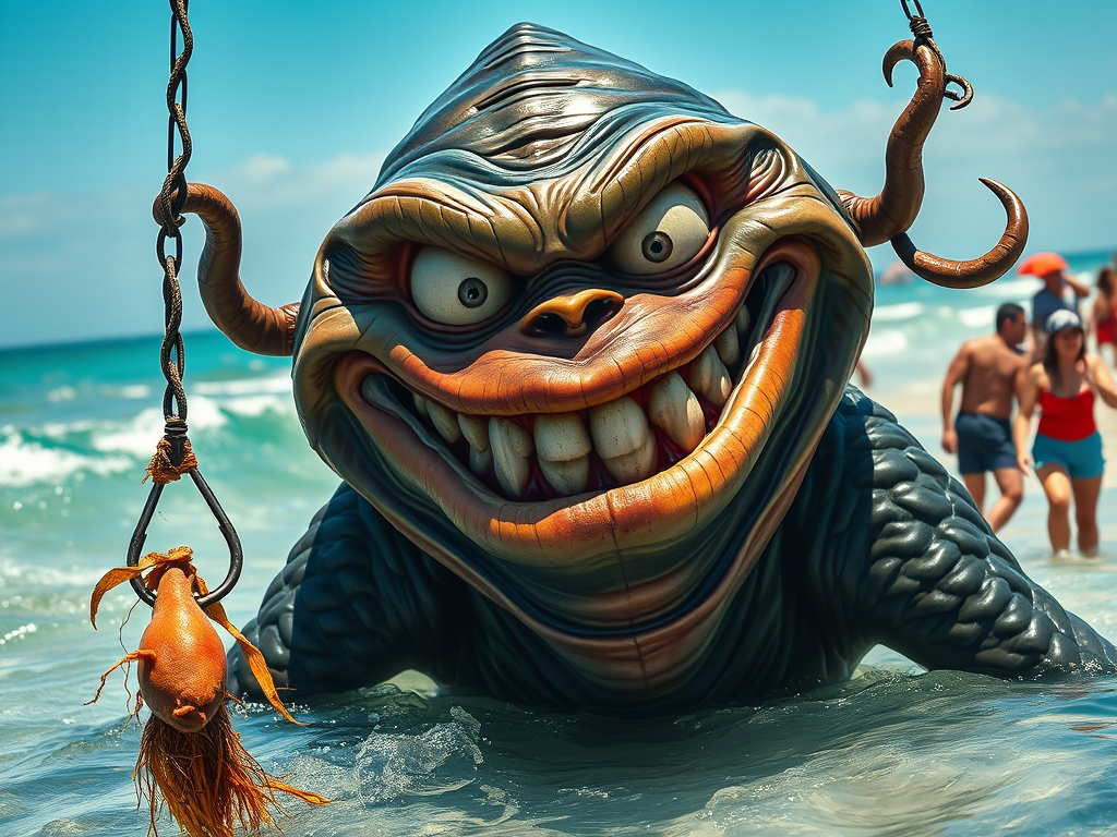 ‘Greetings, my friends,’ Creature said with a hearty wave. ‘I brought the special bait and some wonderful cigars to smoke around the campfire,’ Creature noted with aplomb. ‘I brought Stinky Bait for the big fishing hooks, which is what we use in the Ocean,’ Creature said. ‘You may want to hold your noses as humans find it somewhat objectionable,’ the Creature smiled. ‘I use five pounds of Stinky Bait on each hook,’ the Creature said with a wink.