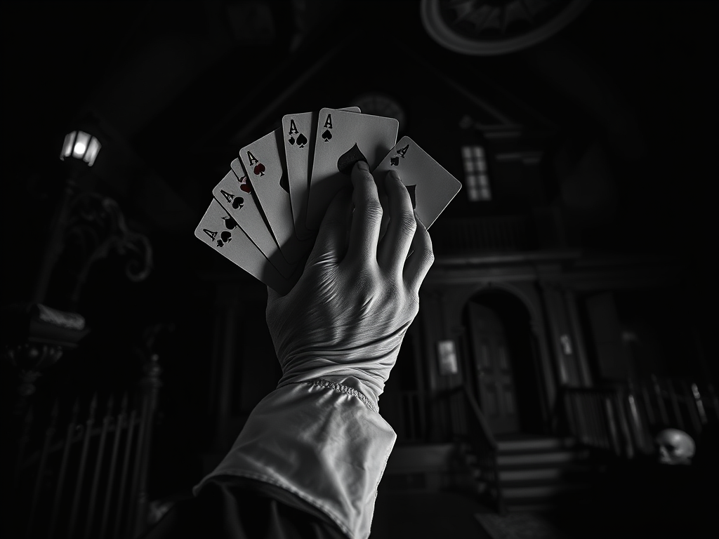 ‘A most exciting development occurred just before you arrived on your Hayride,’ Mrs. Frankenstein said. ‘We heard the scratching from the covered well and opened it to find Thing,’ Mrs. F laughed with joy. ‘It seems he has been captured in the well for over 100 years and is so happy to be with us this Halloween Party,’ Mrs. F continued. ‘Thing is a member of the Addams Family, and Wednesday Addams has joined us this evening for the festivities,’ Mrs. Frankenstien said with a wink. ‘Thing has some card tricks to show us,’