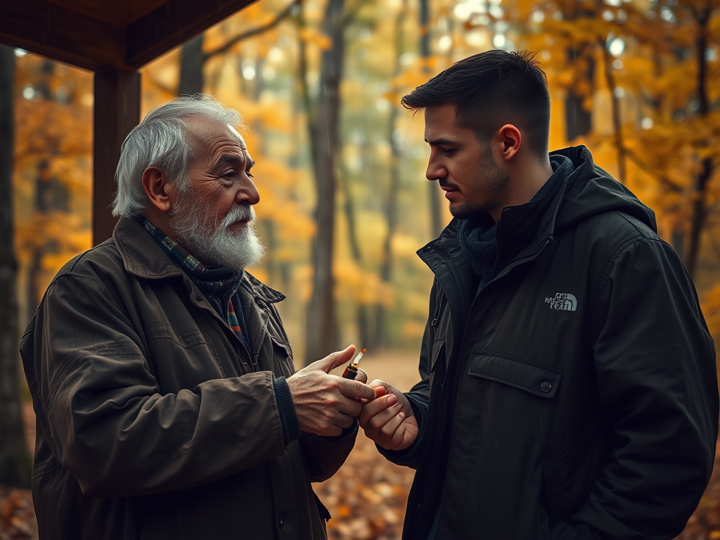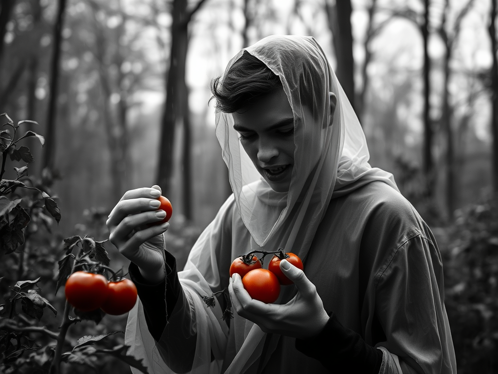 The rain fell hard this morning in the Woods. This is the type of day when no one is exploring other than the Old Man. The hard ground of summer has become the spongy ground of fall. The kind of rain that soaks a raincoat through. The Old Man lit his pipe. In the corner of his eye, he saw a young man hurrying to the shelter with what appeared to be tomatoes in his hand and a white plate. First, the Old Man waved, and the young man kept walking toward a respite from the rain. Then the Old Man spoke, and the young man returned the greeting. He spoke as if the Old Man knew his story. ‘I have three days off work and this is the last day,’ the Young Man said. ‘Three days is too much for being in the Woods in the rain,’ the Young Man noted. ‘I love the Woods and a little rain, but this is more than I bargained for,’ the Young Man continued. The Young Man proceeded to place four ruby-red tomatoes on his white plate and began eating. He looked familiar in a strange sort of way. I wondered where he got the tomatoes that appeared to be garden fresh in mid-fall.