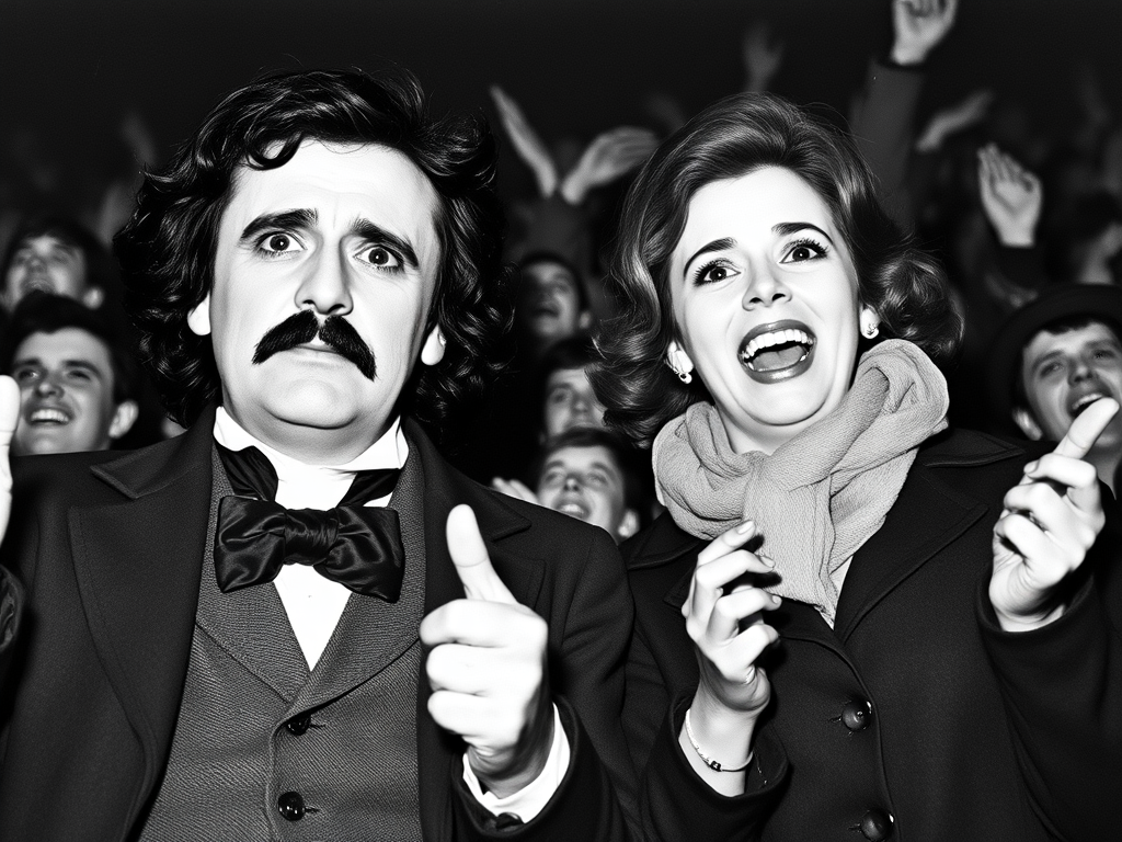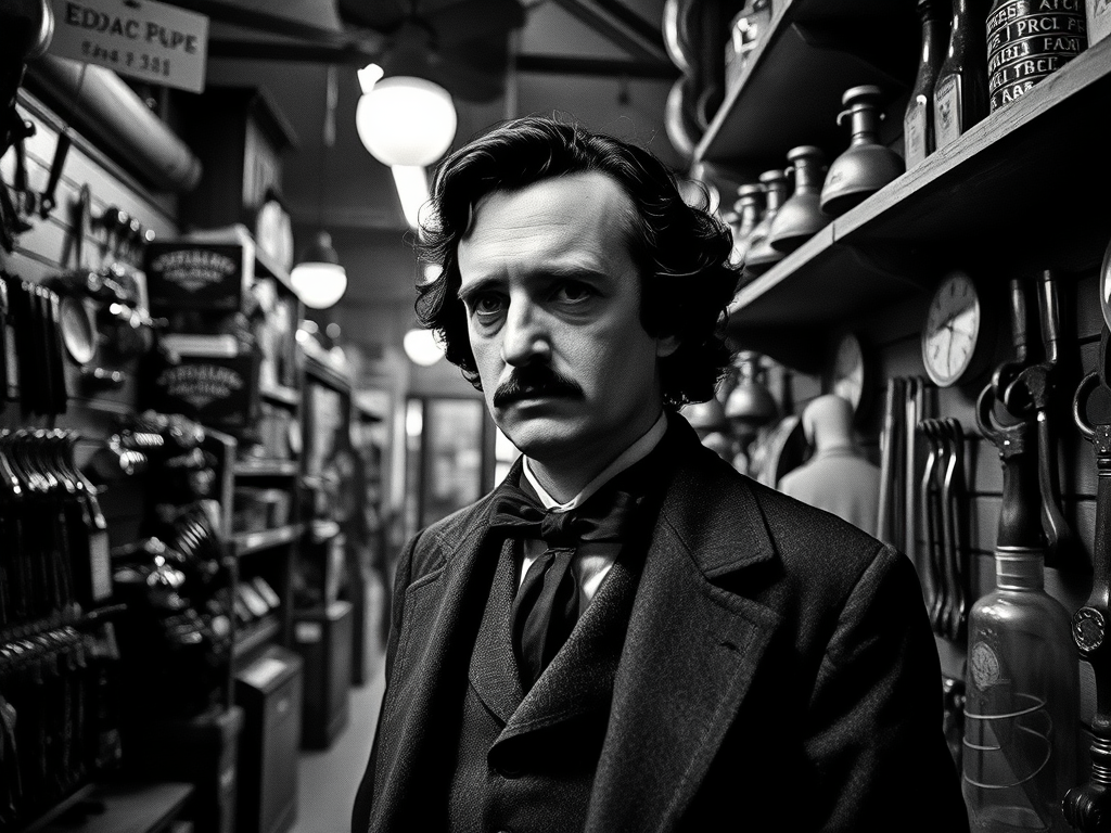 ‘I have read that there were numerous sightings of a man with dark hair and a mustache seen around Eldorado,’ Chet said. ‘He wore a top hat and had a magnificent walking stick with an ivory skull on top,’ Chet continued. ‘He was known as a gentleman and drank spirits copiously,’ Chet observed. ‘He wrote for the Eldorado newspaper under the name Allen Poe and was well read,’ Chet explained. ‘He was from Massachusetts,’ Chet noted. ‘Mr. Poe wrote several detective stories while he resided in the Old Vic on Illinois,’ Chet said. ‘He was a sad man who became sadder when he drank,’ Chet commented. ‘He spoke of his beloved Annabel Lee, but no one ever met her,’ Chet said with a sigh. ‘Edgar Allen Poe is said to roam the long porch of the Victorian House on Illinois Avenue and is often seen with a young dark-headed woman of unparalleled beauty and mystery,’ Chet observed. ‘At times, the etheral creatures are rumored to walk across the street to the High School to watch the football team play,’ Chet laughed. ‘The lovely woman always cheers for the Eldorado Eagles,’ Chet winked.
