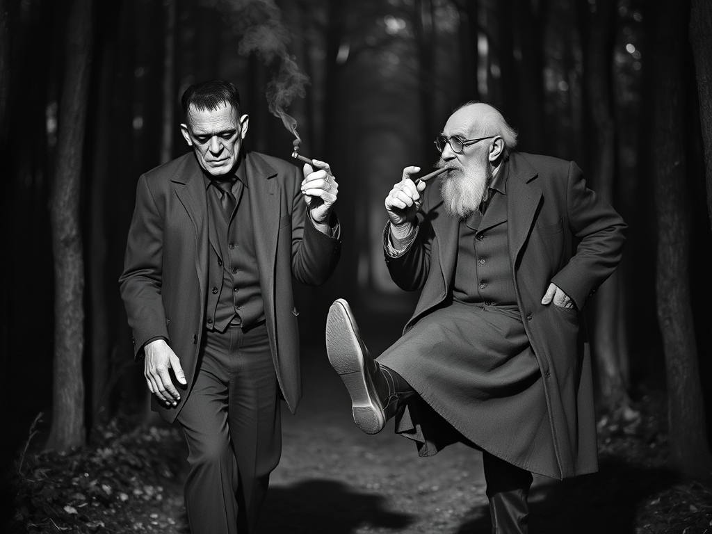 ‘I must admit I am a mellow fellow,’ Frankenstein admitted. ‘I like walking in the Woods with the Old Man,’ Frankenstein said. ‘Today we smoked some little fine cigars,’ Frankenstein reminisced. ‘I told him that cigars were good,’ Frankenstein laughed. ‘It is one of my most famous movie quotes,’ Frankenstein danced on one foot and then the other. ‘The Missus says I am too mellow and that I should get upset when someone wrongs me,’ Frankenstein observed. ‘I told her we are only human, or in my case, several humans.’ Frankenstein laughed heartily. ‘When I hurt someone’s feelings, I feel pain,’ Frankenstein noted. ‘I prefer picking flowers and photographing the changing autumn leaves,’ Frankenstein explained. ‘I am a strict observer of tea time as I am British,’ Frankenstein smiled thoughtfully.