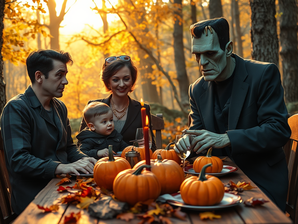 ‘I have never eaten such succulent Turkey,’ Frank N. Stein noted. ‘You know we feared no one was going to invite us to Thanksgiving Dinner but hoped that the new Frankenstein movie would help folks not forget us,’ Frank N. Stein said. ‘It portrays me a bit harshly, but I understand box office and all,’ Frank said softly. ‘My Bride and I are so pleased to have our son with us as he is home from SIUC,’ Frank said with a proud smile. ‘He is majoring in Biology and the study of creating life,’ Frank smiled. He wants to follow in the steps of his grandfather,’ Frank N. Stein laughed.