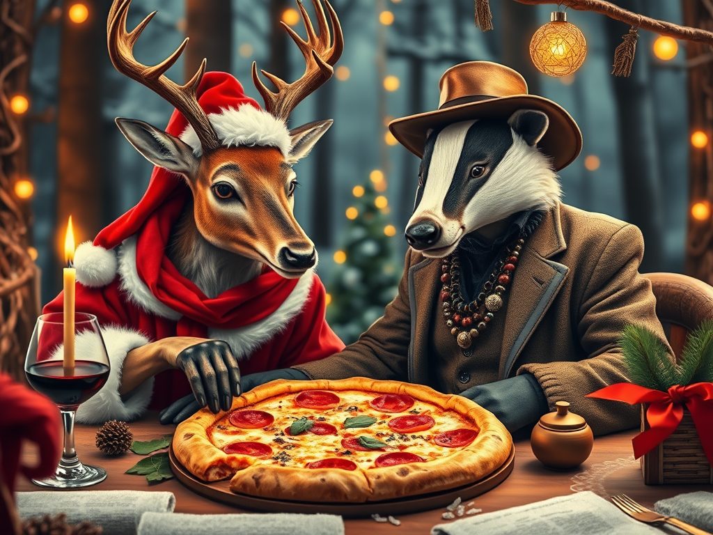 The Old Man walked in the Christmas Woods. The deer walked with him and asked him if he was coming to the Christmas Eve Service. ‘We will have a feast before Christmas,’ Herman said. ‘Now by a feast I mean we are getting pizzas from Dominos as they are on Christmas Eve sale and we all know there will be some belt loosening Christmas Day,’ Herman Deer continued. ‘There will be homemade fudge and Christmas Coffee Cake, Figgy Pudding and pumpkin pie, ‘Herman Deer added. ‘Mr. Badger and Mr. Mole are coming along with Toady and Ratty, and they are coming by boat with Toady manning the mainsail,’ Herman laughed. ‘Next year shall be better, we will live in more peace, we will listen to our hearts and not our wallets,’ Herman promised.
