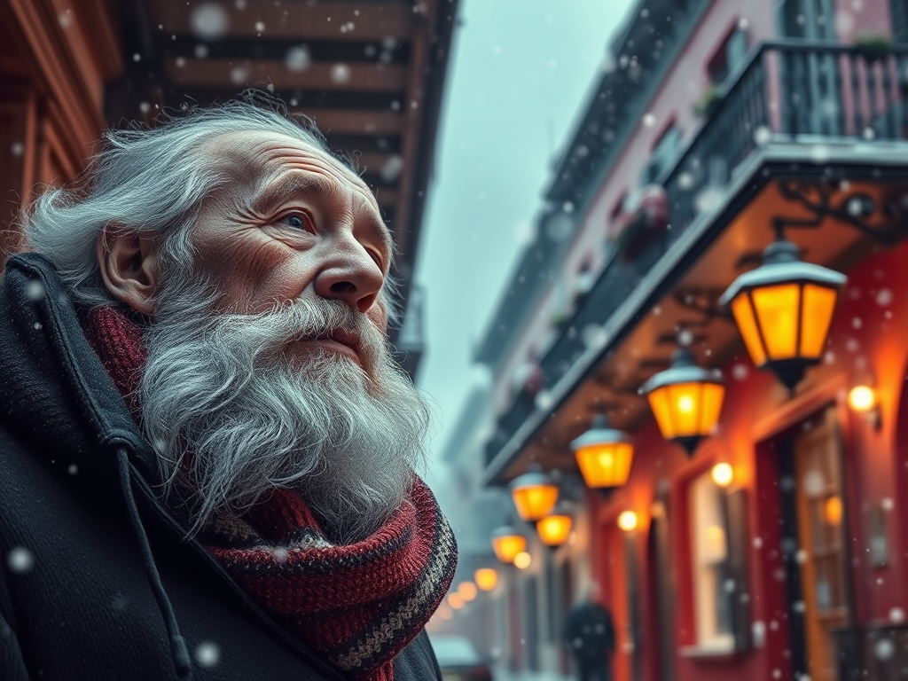 ‘So it is snowing in the French Quarter, and we are a part of the historic event,’ the Old Man said. ‘Bourbon Street is covered with a white blanket,’ the Old Man continued. ‘The doorman was sweeping the snow away this morning from the front of the Hotel Monteleone,’ the Old man noted. ‘People are laughing and dancing in the snow,’ the Old man laughed. ‘A jazz band marched down Royal Street playing Santa Claus Is Coming To Town,’ the Old Man grinned.