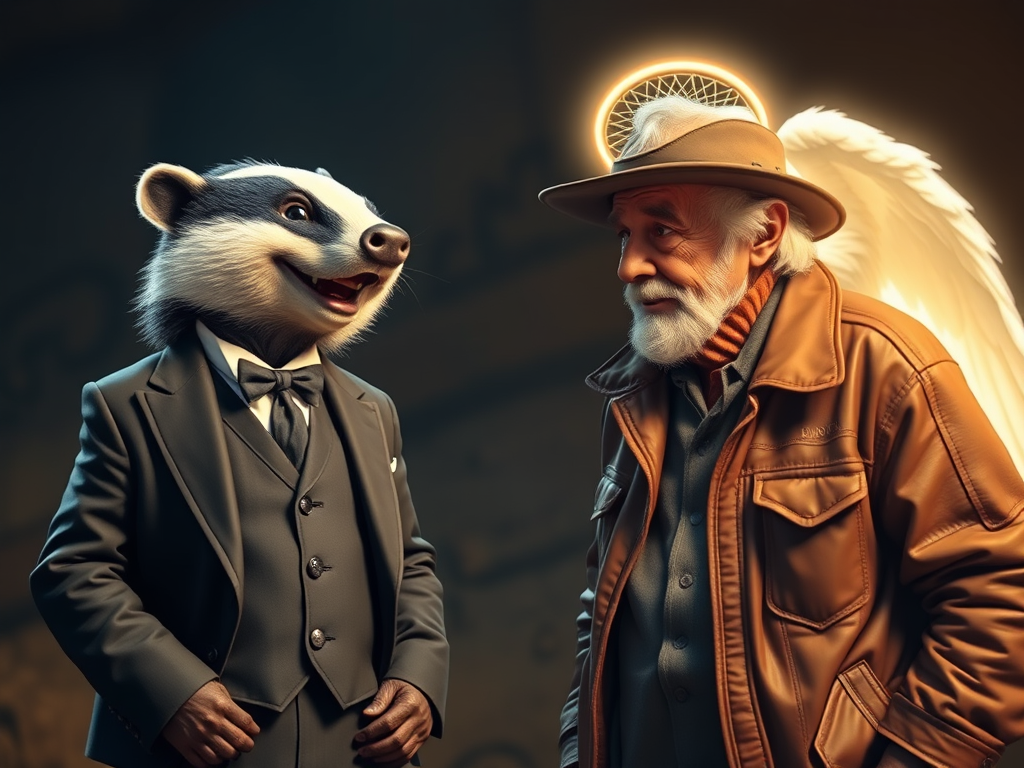 ‘Greetings and salutations, OM and Moley,’ Mr. Badger said. ‘You’re both are Hale Fellows Well Met,’ Mr. Badger chuckled. ‘I see your Guardian Angels are accompanying you on your morning constitutional,’ Mr. Badger noted with a wink and nod. ‘You make a fine foursome,’ Badger said with a wide grin.