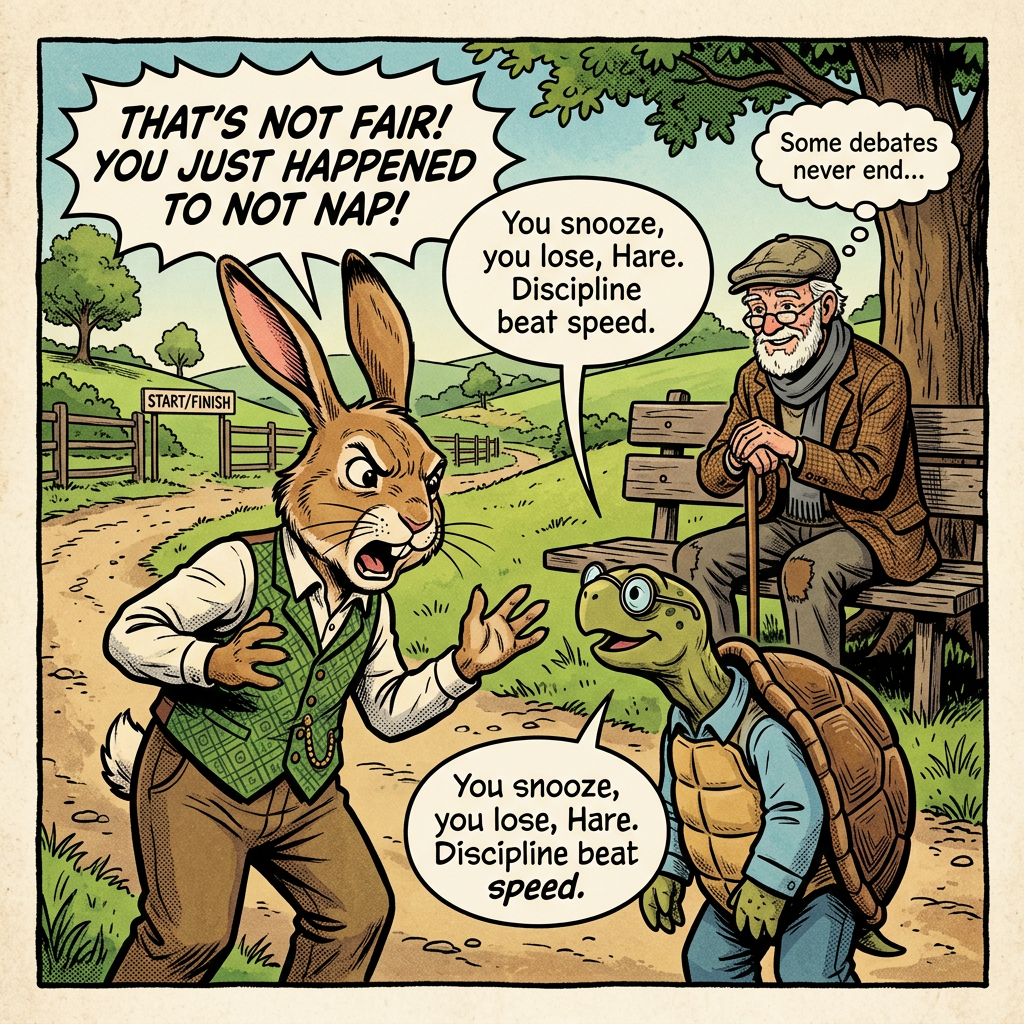 ‘Nice seeing you, Mr. Hare…I knew your father and your uncle,’ Mr. Tortoise said. ‘They were quite fast and won many races,’ Mr. Tortoise continued. ‘I used to watch them from the viewing stands,’ Mr. Tortoise continued. ‘Your family seems to rely on bluster as a diversion,’ Mr. Tortoise observed. ‘This is an excellent rhetorical device…until your opponent understands its utilization,’ Mr. Tortoise continued. ‘I have a quiet approach…I watch what works and inculcate best practices into my race,’ Mr. Tortoise mused. ‘I sleep little…I watch and research daily,’ Mr. Tortoise advised.