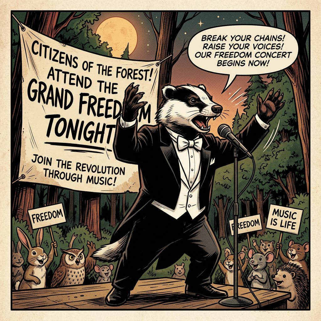 ‘Our concert will be for Freedom…speaking truth without fear of retaliation…the beauty of Art over politics,’ Mr. Badger proclaimed. ‘We are done watching the carnage of our politicians’ abuse of the Earth,’ Badger continued. ‘We must not cower in fear of a bully…bullies are blowhards with no plan and too much puffery,’ Mr. Badger noted.