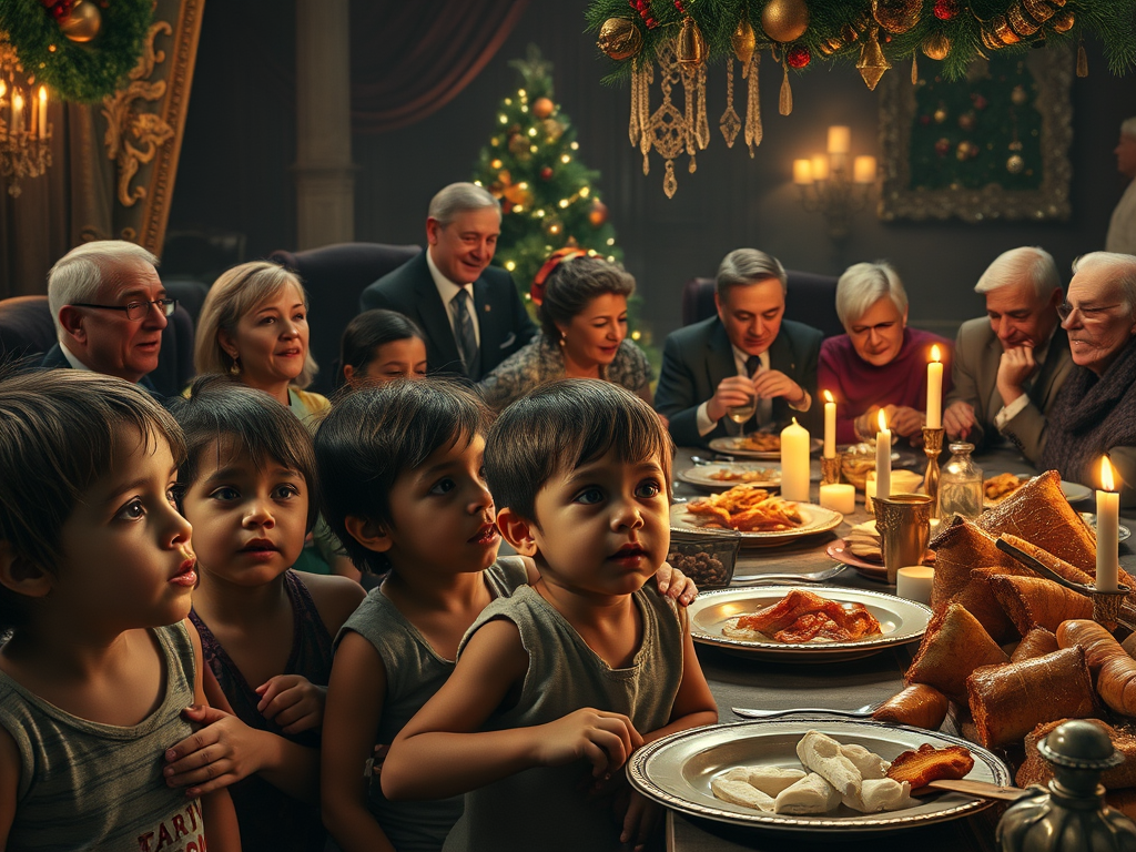 Happy children exit Walmart with Switch IIs and expensive Christmas gifts. They laugh when they think of surprises and mysteries awaiting them on Christmas morning. There will be plum pudding and roast goose. Also figgy pudding and a warm fire in the fireplace. They know not fear or want. Their fat cheeks are rosy aglow with the message that the Baby Jesus came to Earth because he loves all the little children of the world. Red, yellow, black, and white are all precious in his sight. The Christmas Stockings hung by the chimmeny with care are bursting with Christmas Joy.