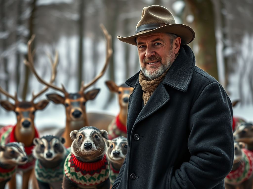 A powerful wind blew. Cold air was arriving. The trees were bare. The Old Man braced against the chill. He walked with determination and Christmas resolve. The Woods Animals followed with dancing and song. Some sang Silent Night while others hummed Rudolph the Red-Nosed Reindeer.