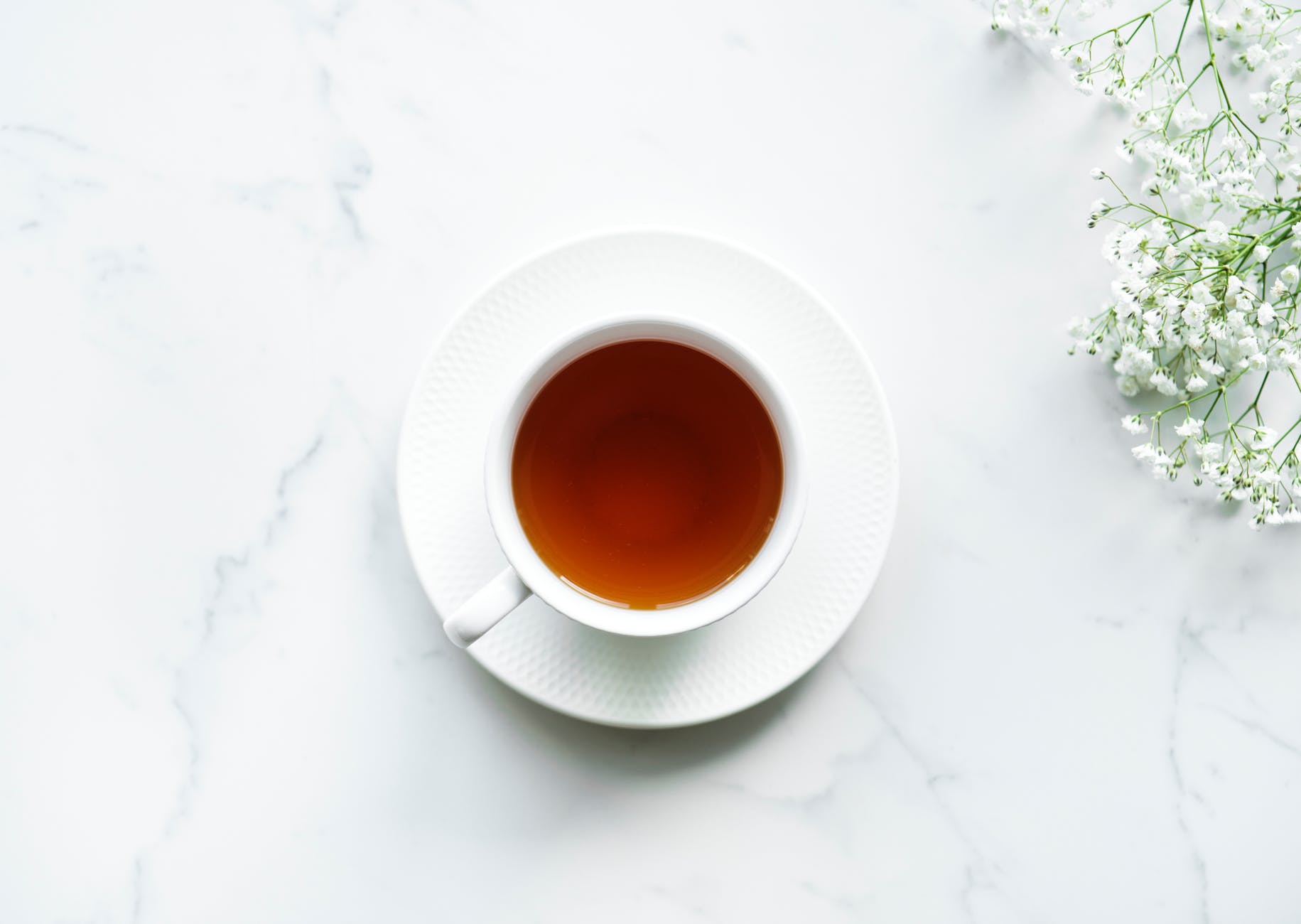 white ceramic teacup on saucer with brown liquid