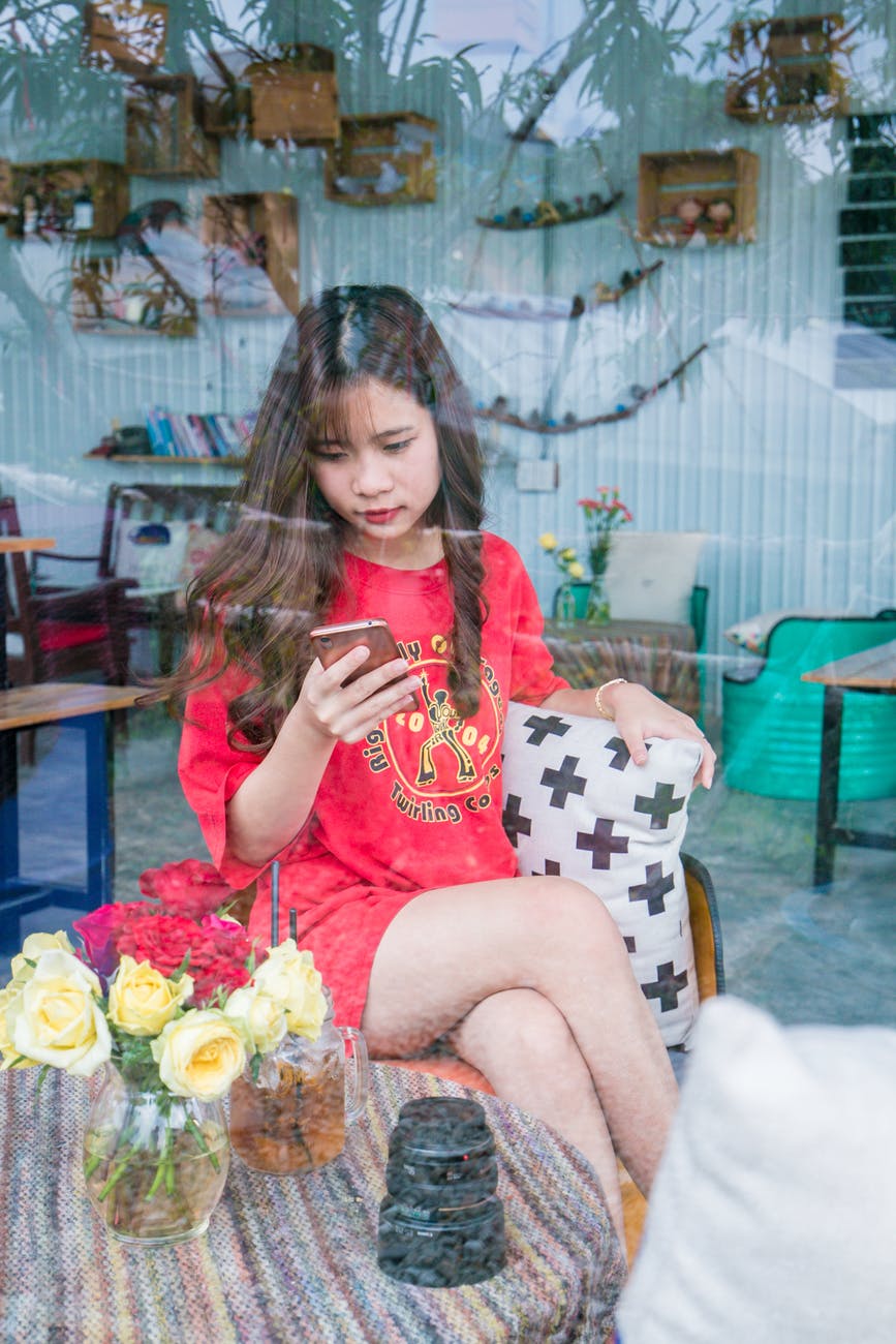 woman using smartphone sitting on chair