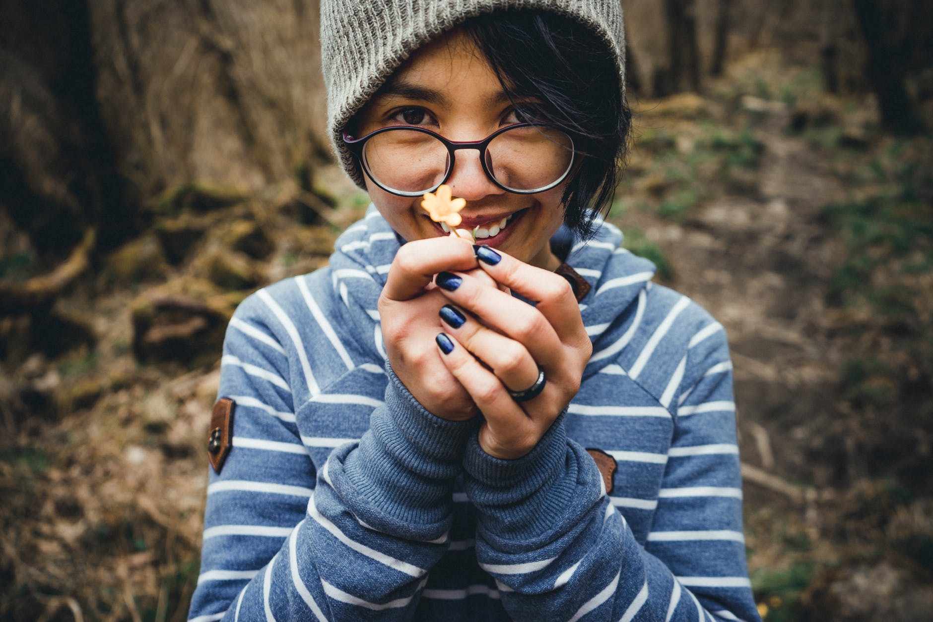 woman in blue and white striped pullover hoodie holding flower