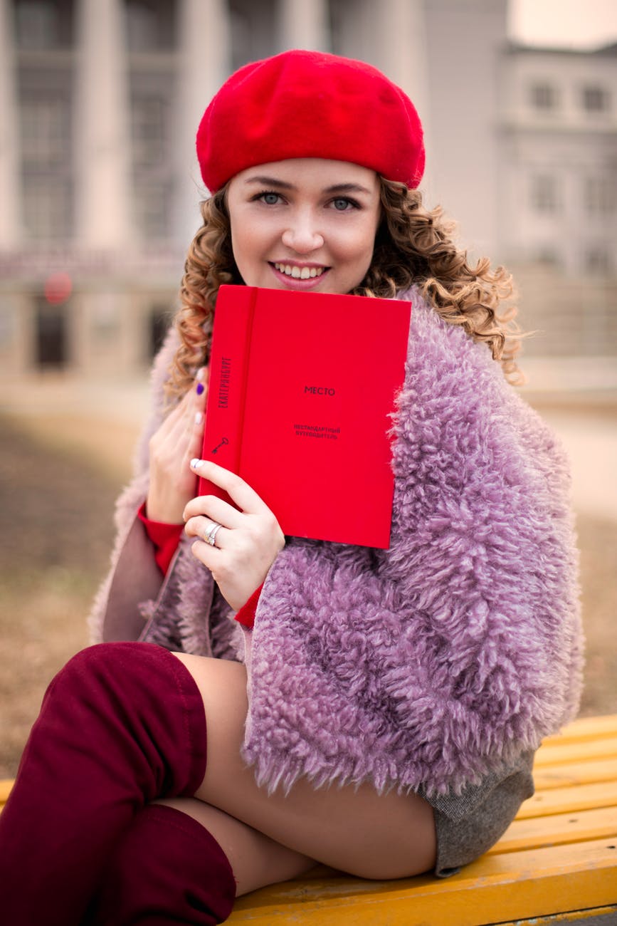 woman wearing purple coat and gray shorts sitting on brown chair