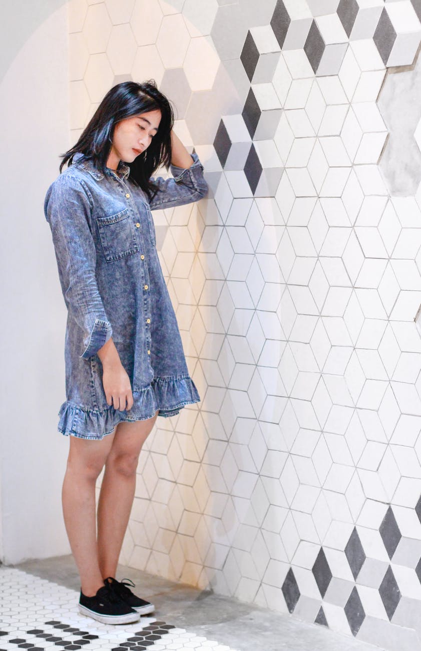 woman wearing blue denim button up long sleeved dress holding her head with her left hand standing near white and gray concrete wall