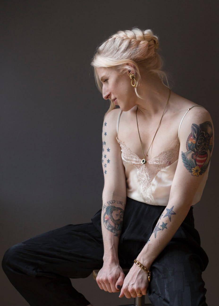 woman wearing brown spaghetti strap shirt and black pants