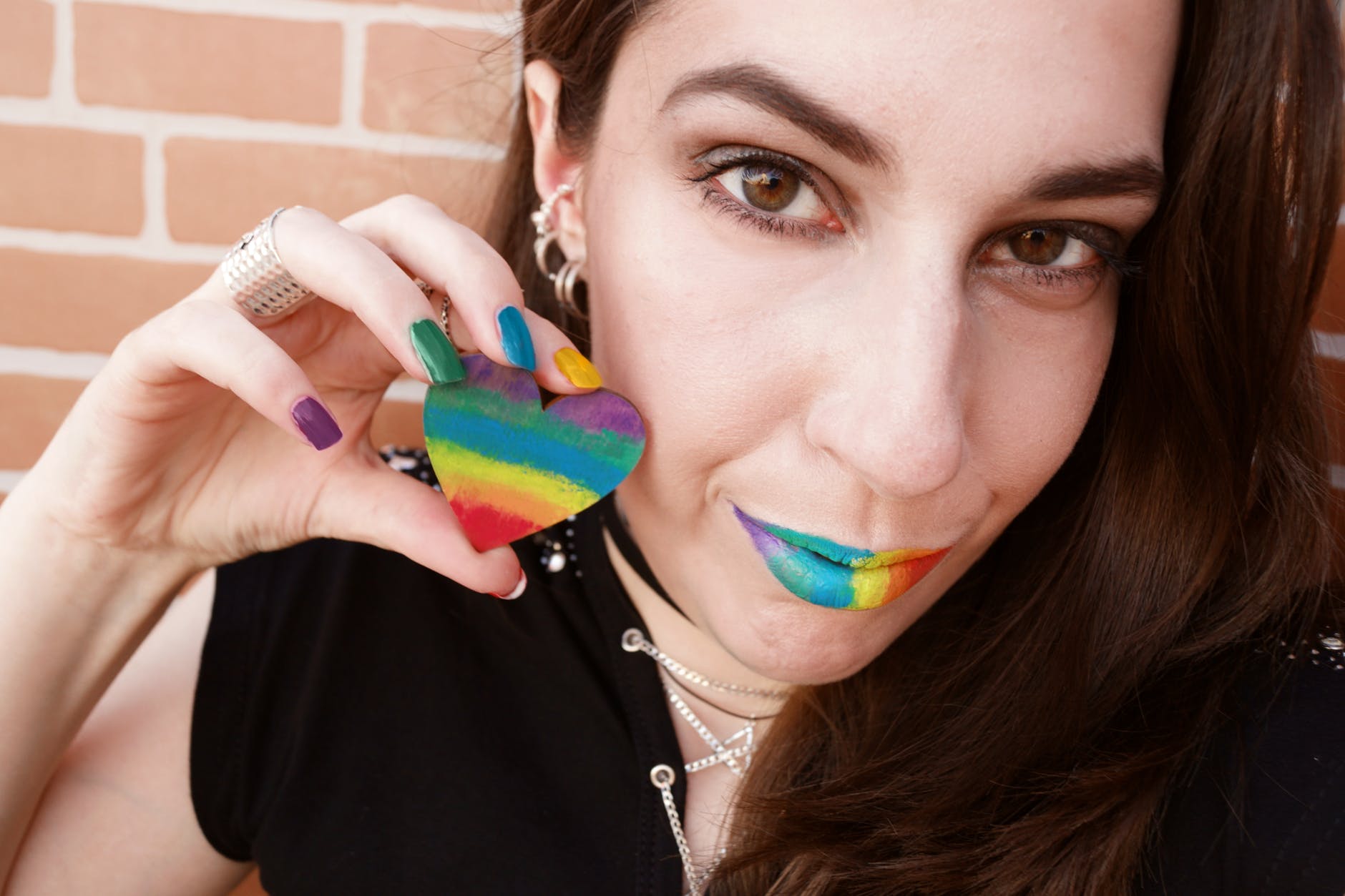 woman wearing black shirt holds striped heart decor