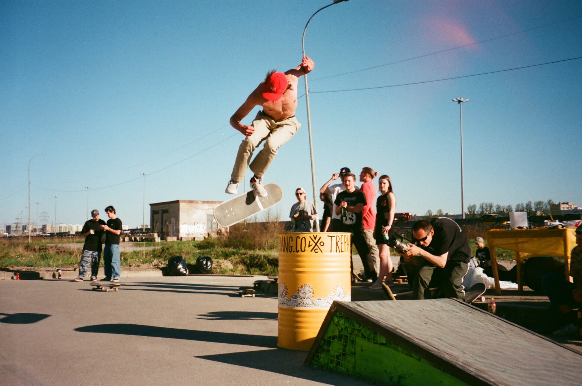 person in beige pants riding skateboard over yellow metal barrel
