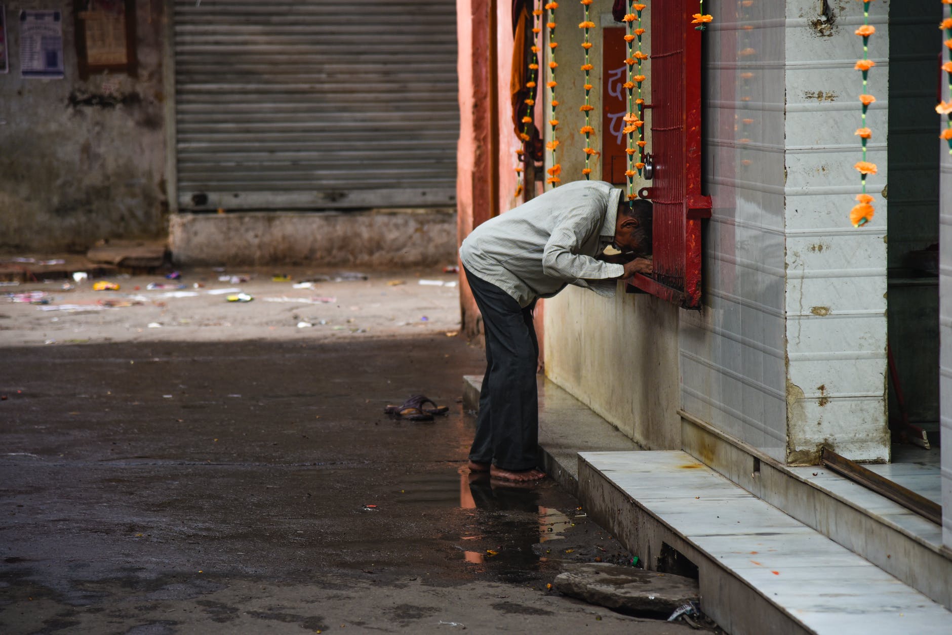 man in white long sleeved shirt on red window