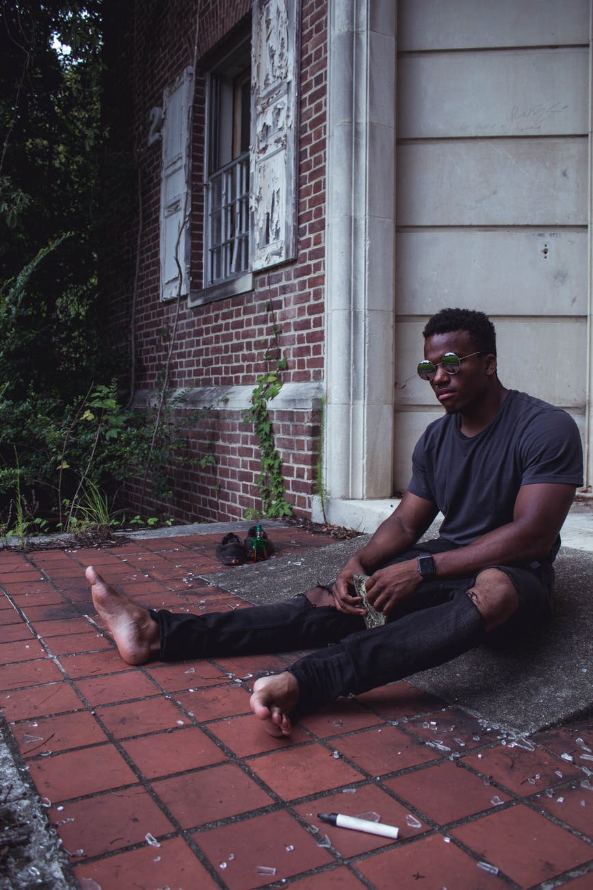 man in black t shirt wearing sunglasses while sitting in front of door