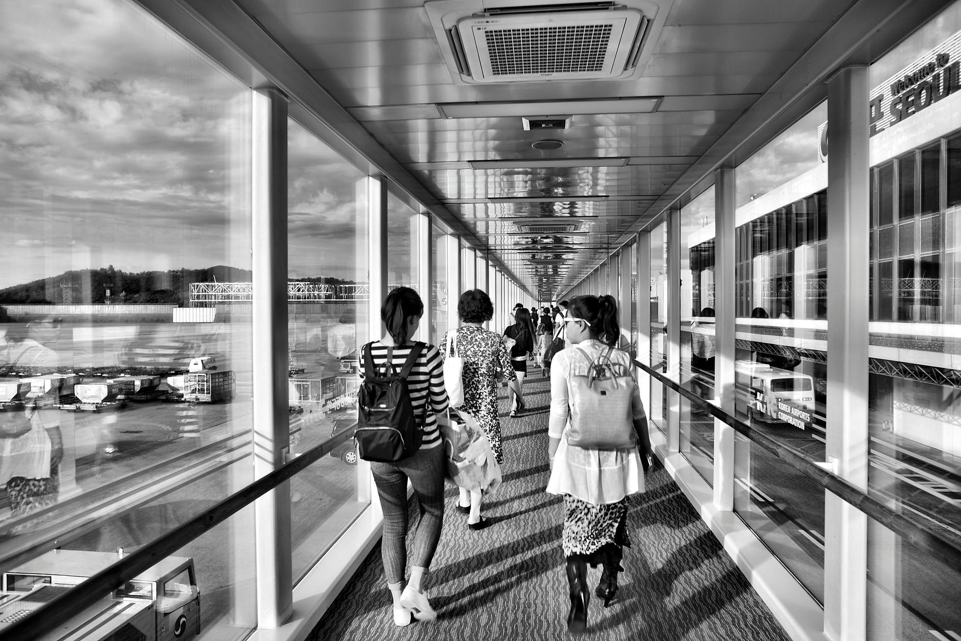 grayscale photo of woman walking on pathway