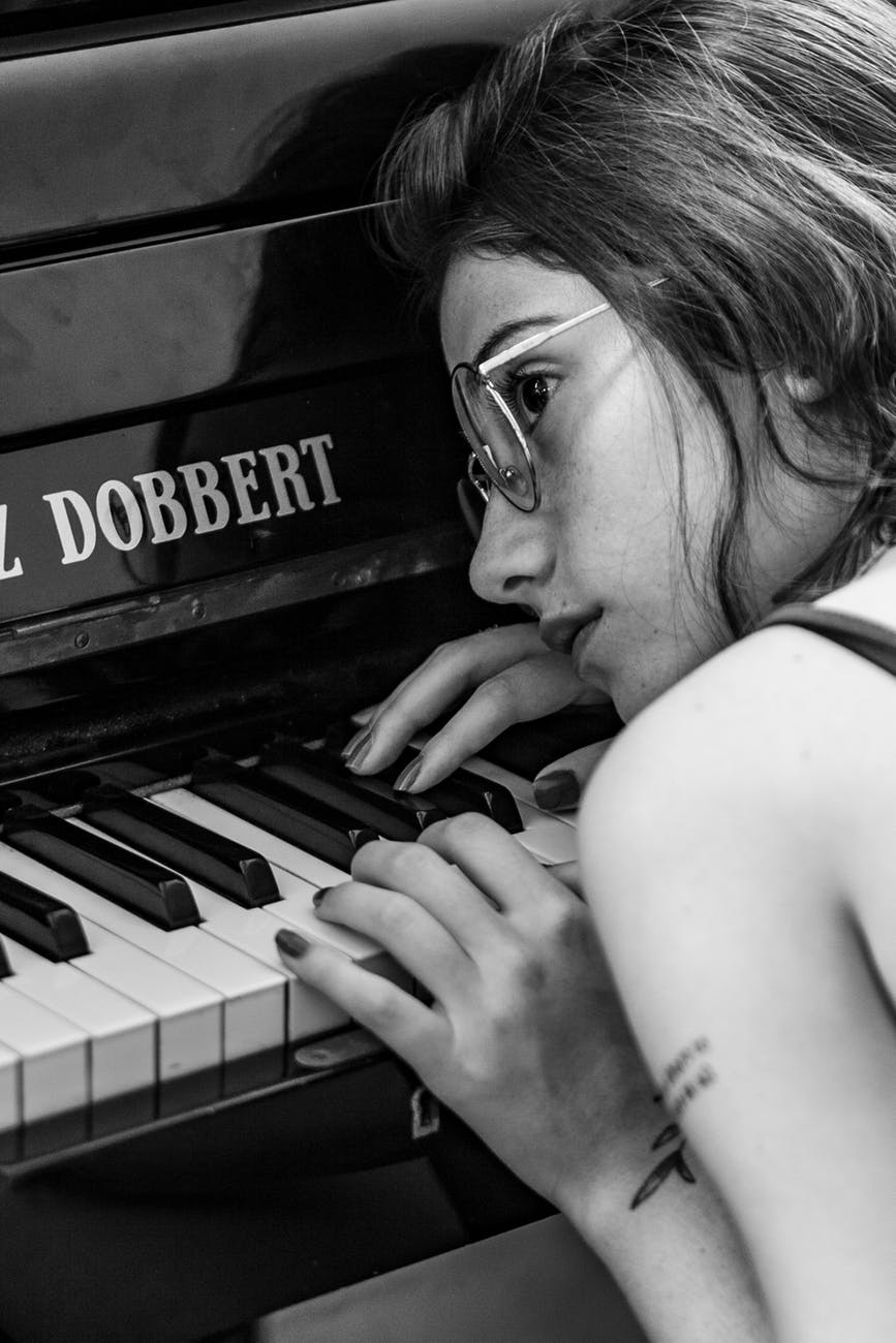 woman wearing eyeglasses leaning on piano