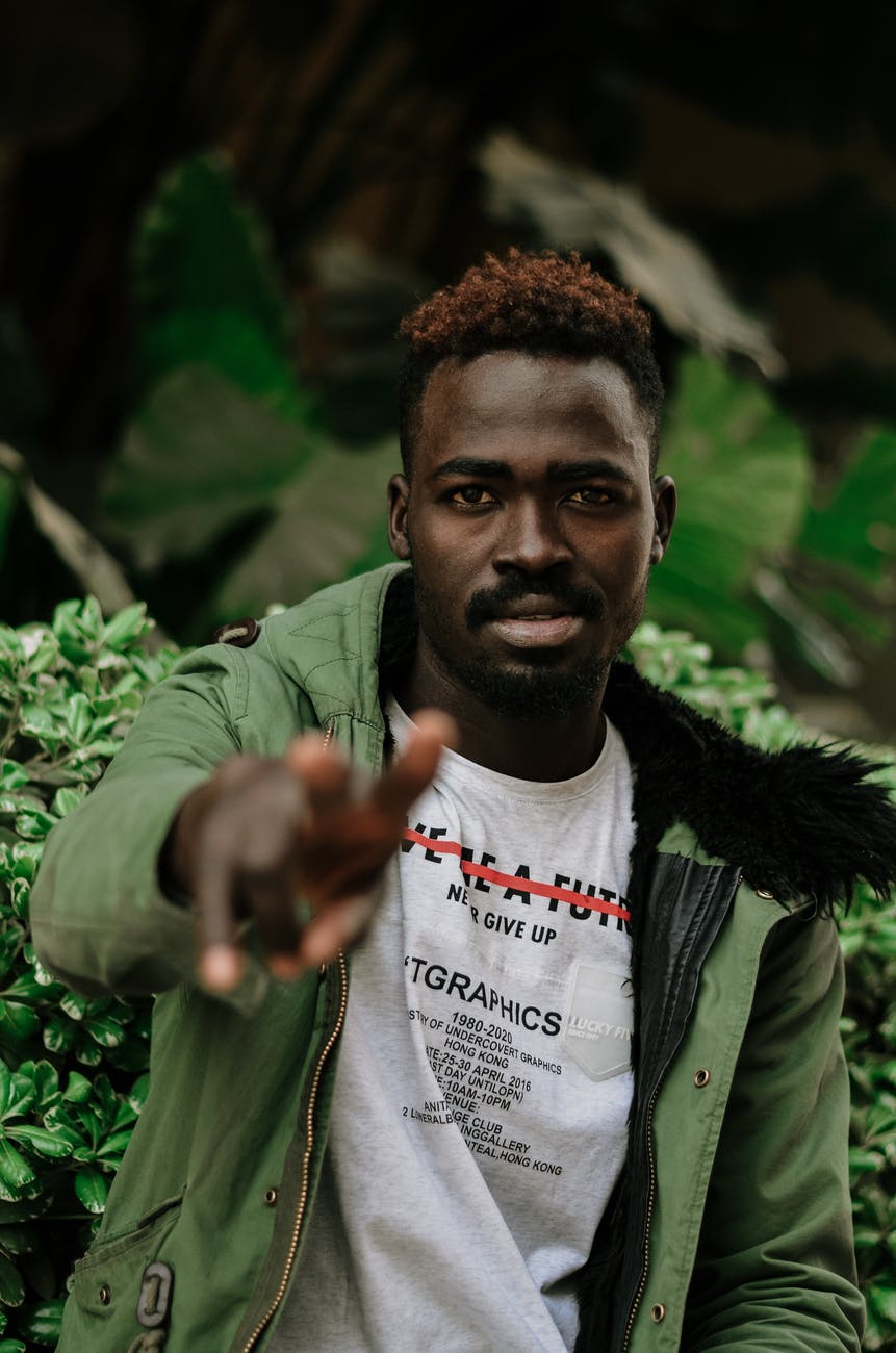 man sitting next to green plant