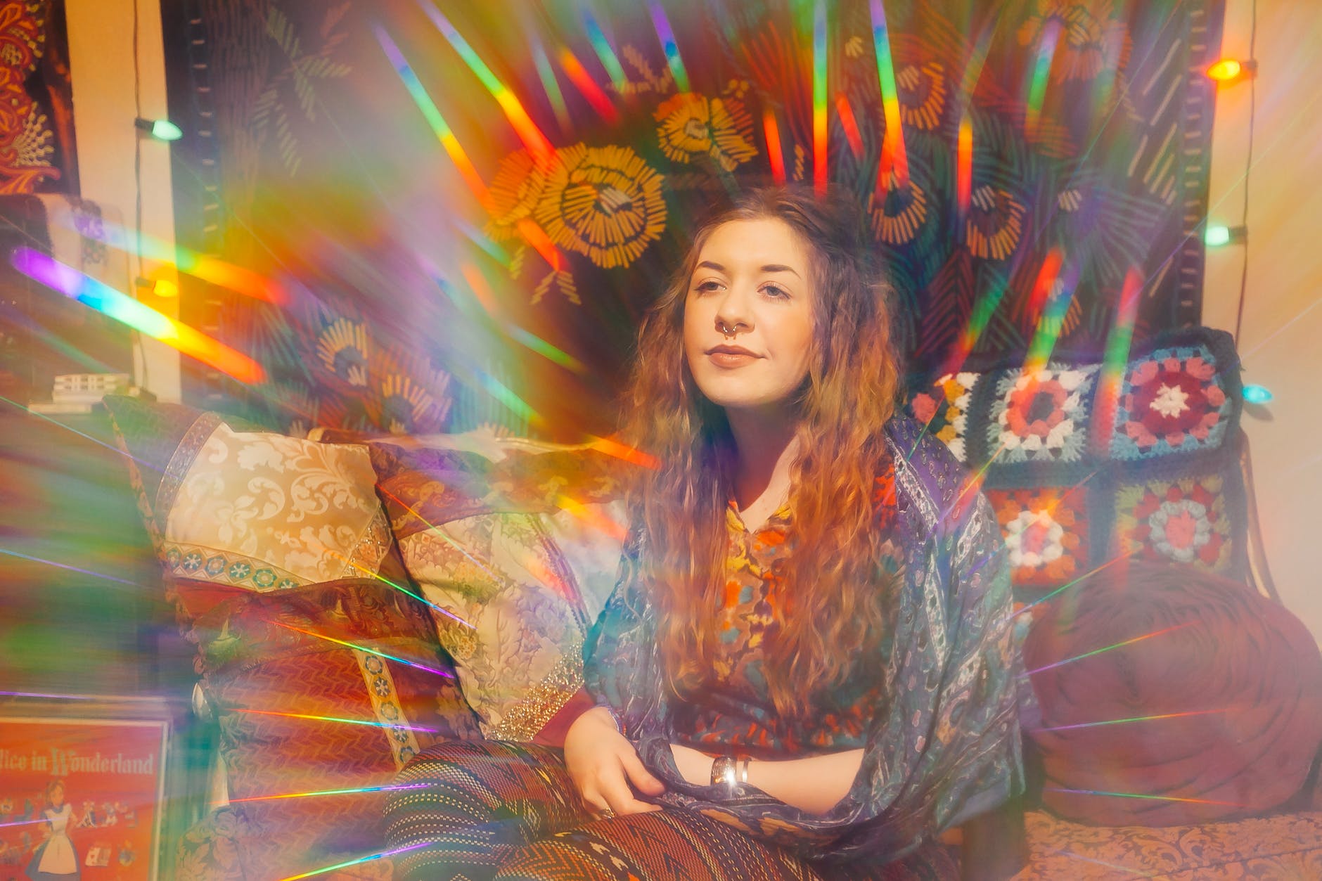 woman in gray top sitting on sofa