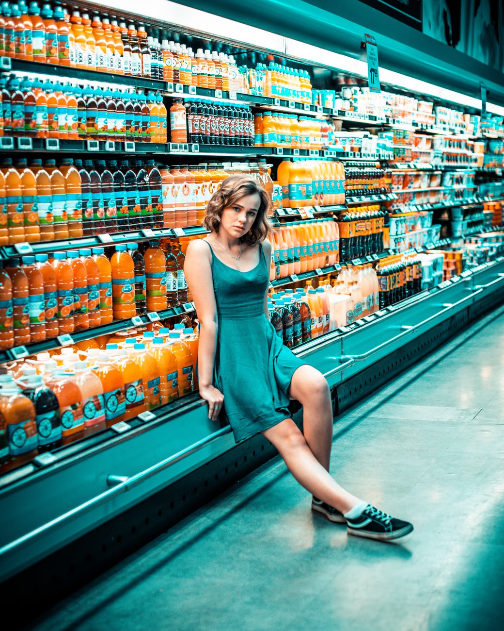 photo of woman sitting beside beverage section in grocery store