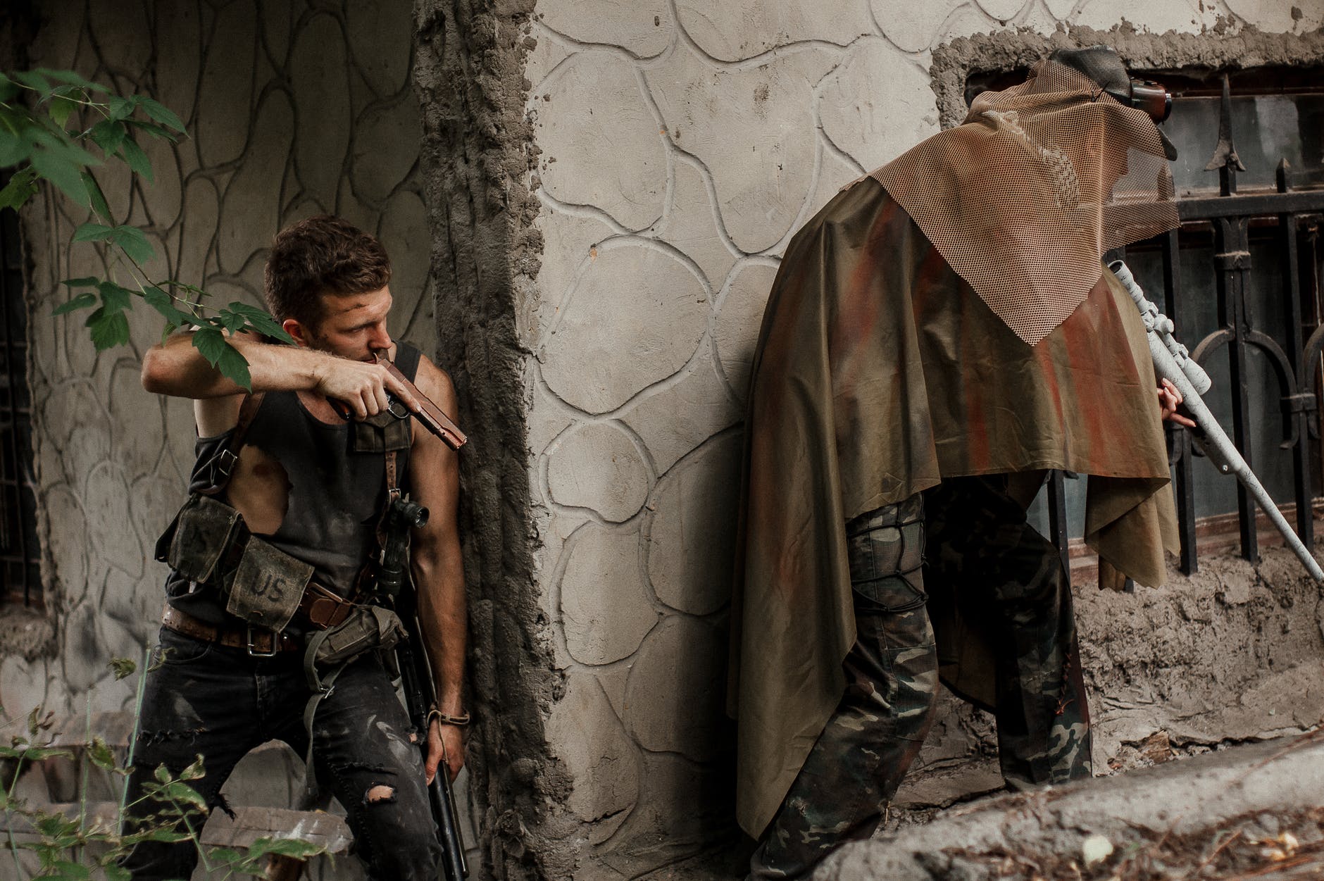 military men holding guns beside concrete corner
