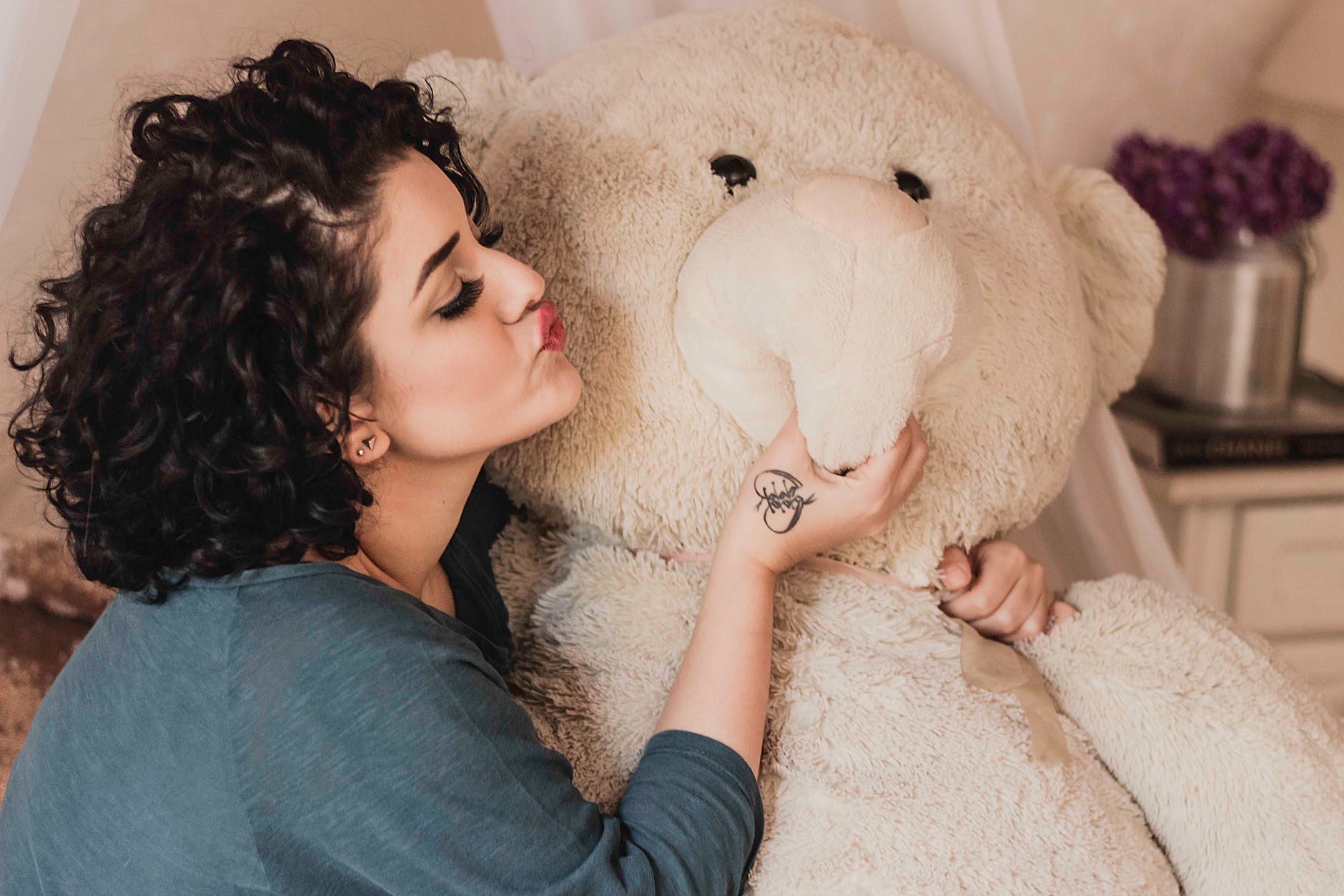 woman giving a kiss to life sized plush toy