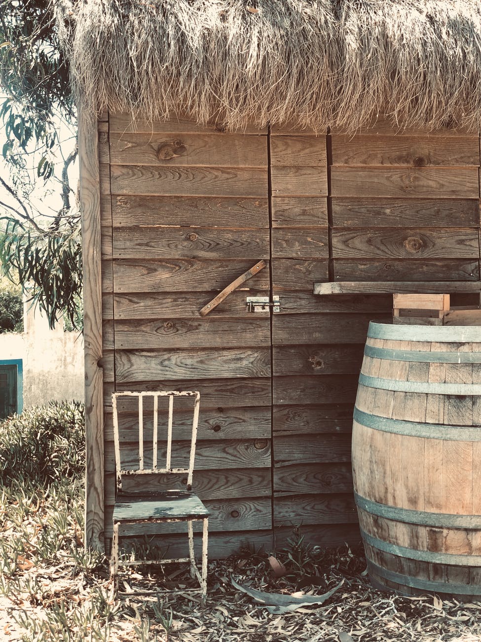 white metal chair beside brown wooden barrel