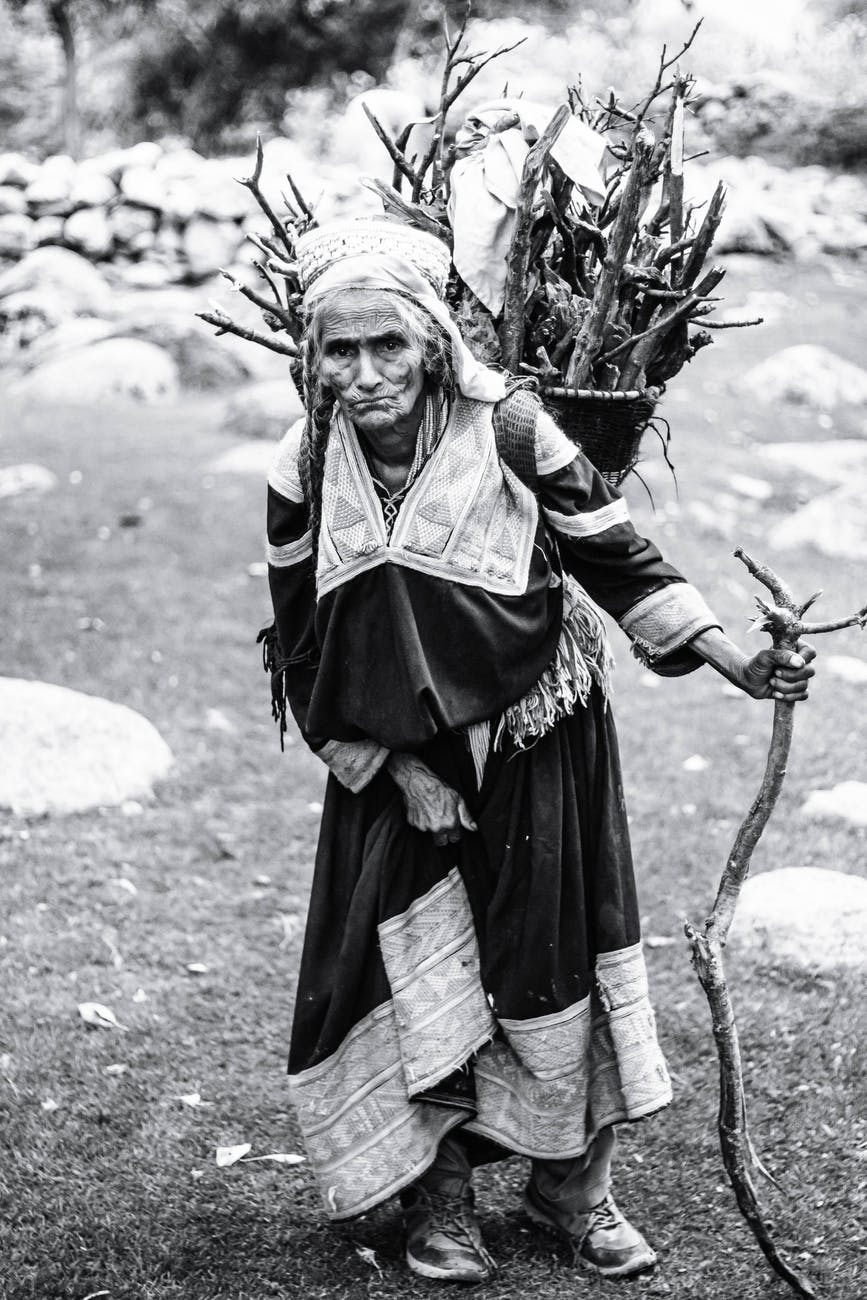 grayscale photography of woman carrying branches