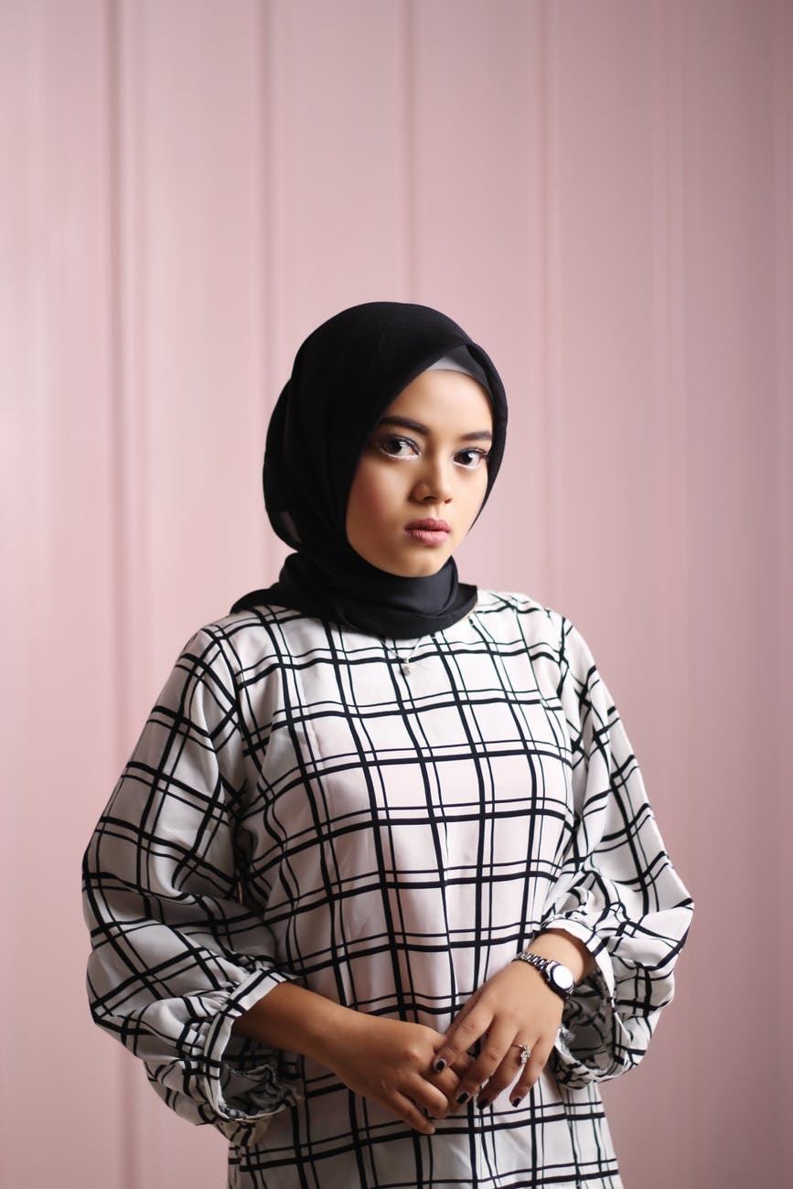 woman wearing white and black grid pattern dress and black hijab standing near wall