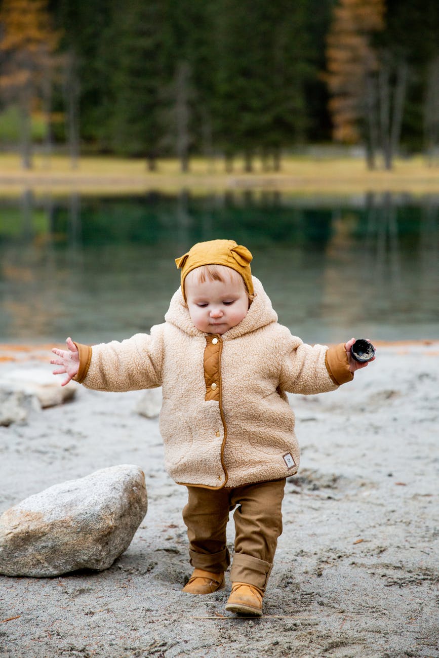 child in brown jacket and yellow knit cap standing on sand near big rock