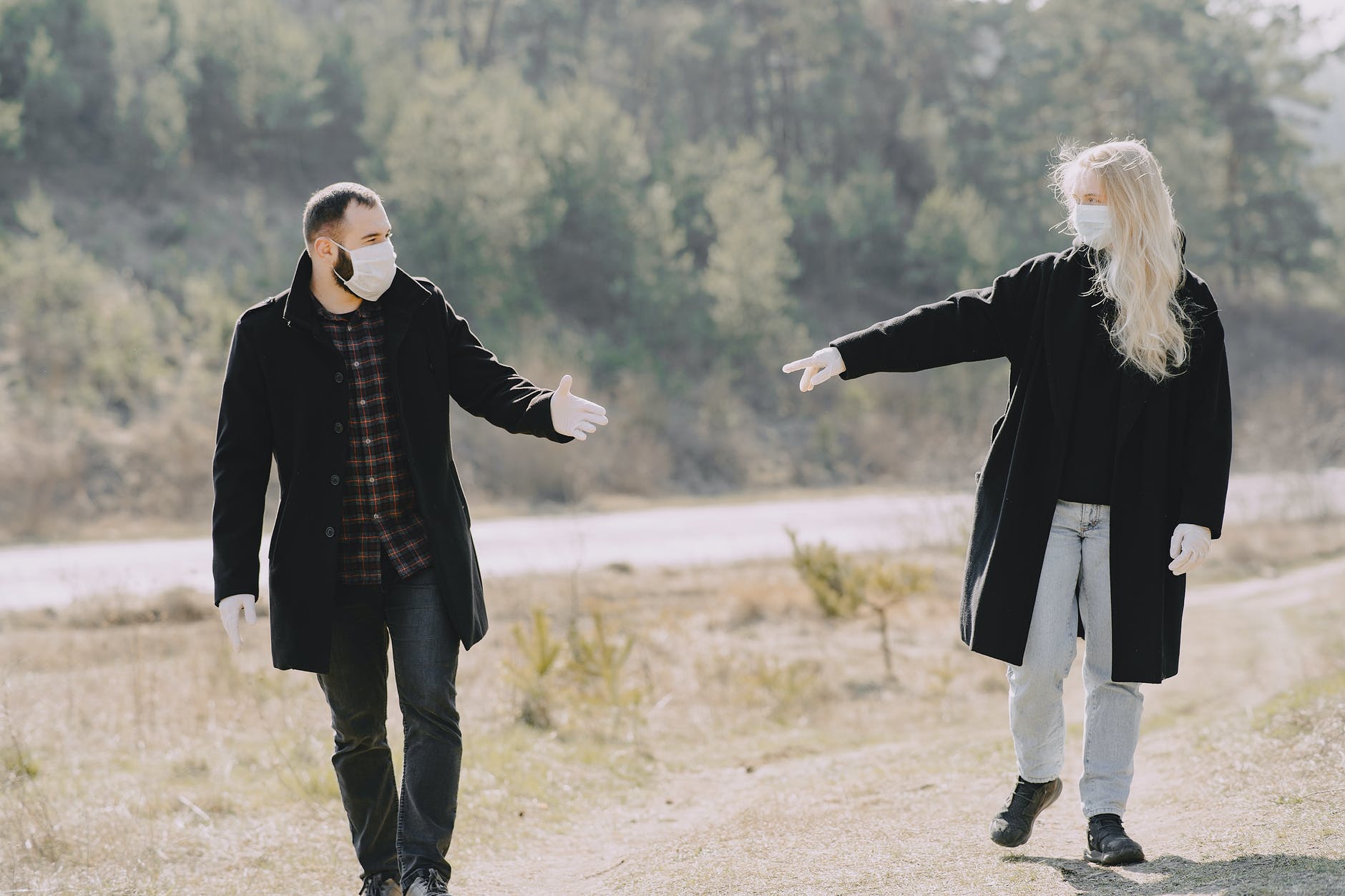 friends in medical gloves and masks walking along road in spring forest during pandemic