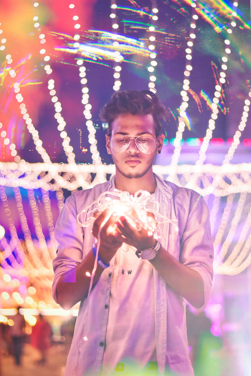 man holding string light during nighttime