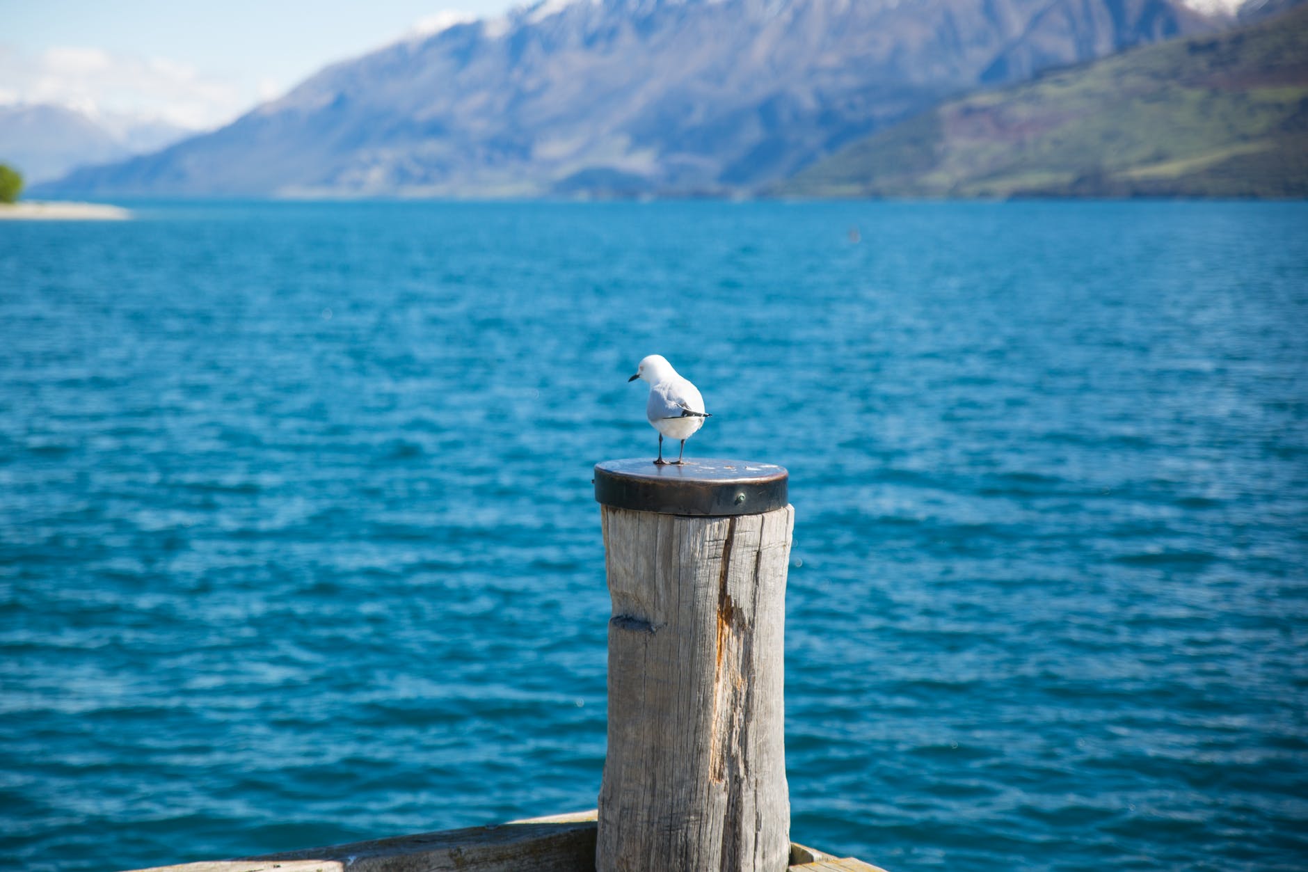 depth of field photography of white gull on top of brown wooden pole in front of body of water