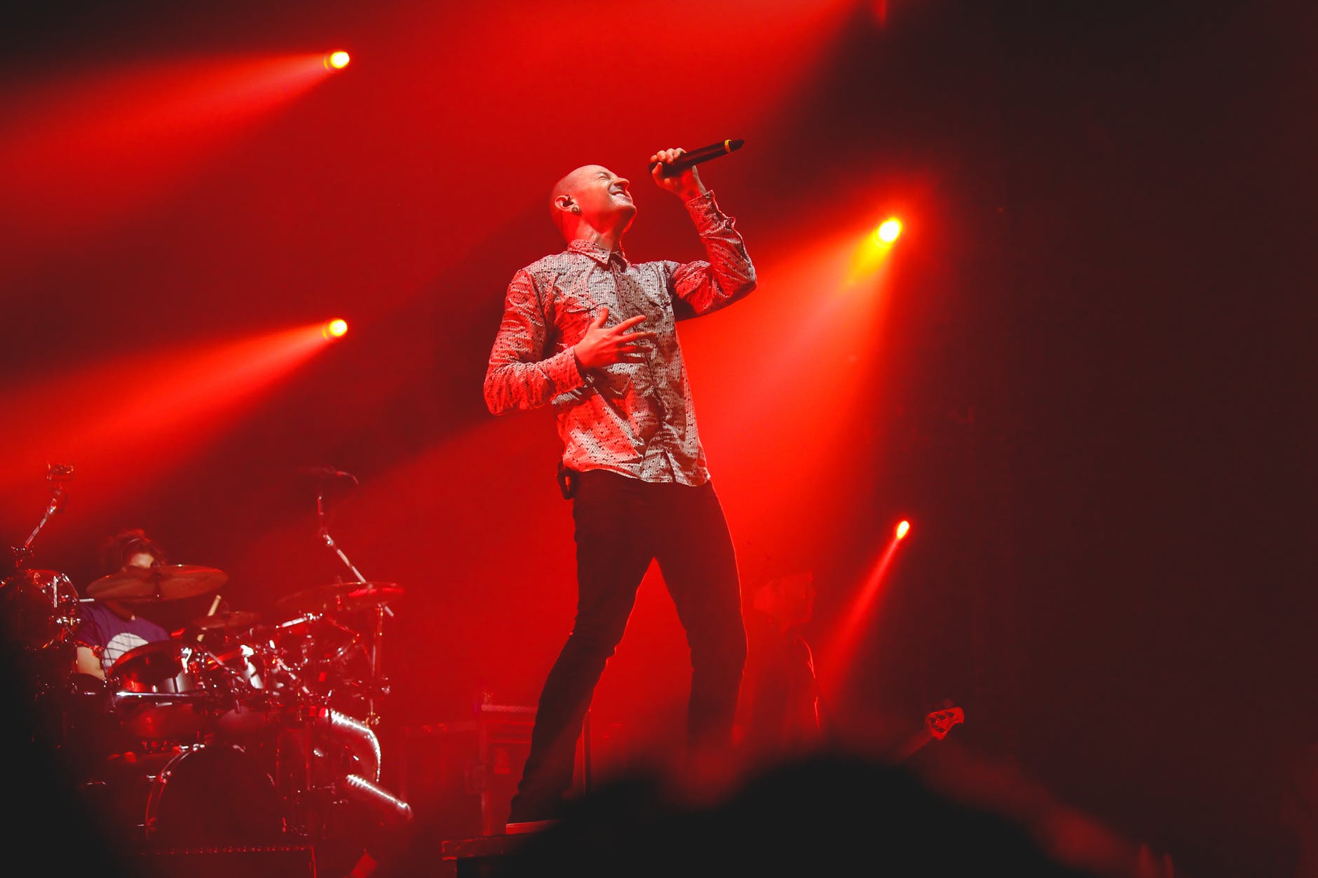 man wearing grey button up dress shirt and black fitted pants holding black cordless microphone